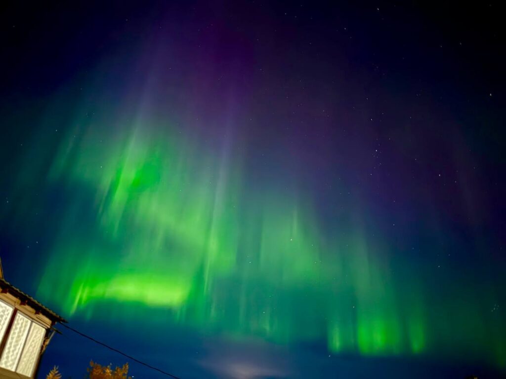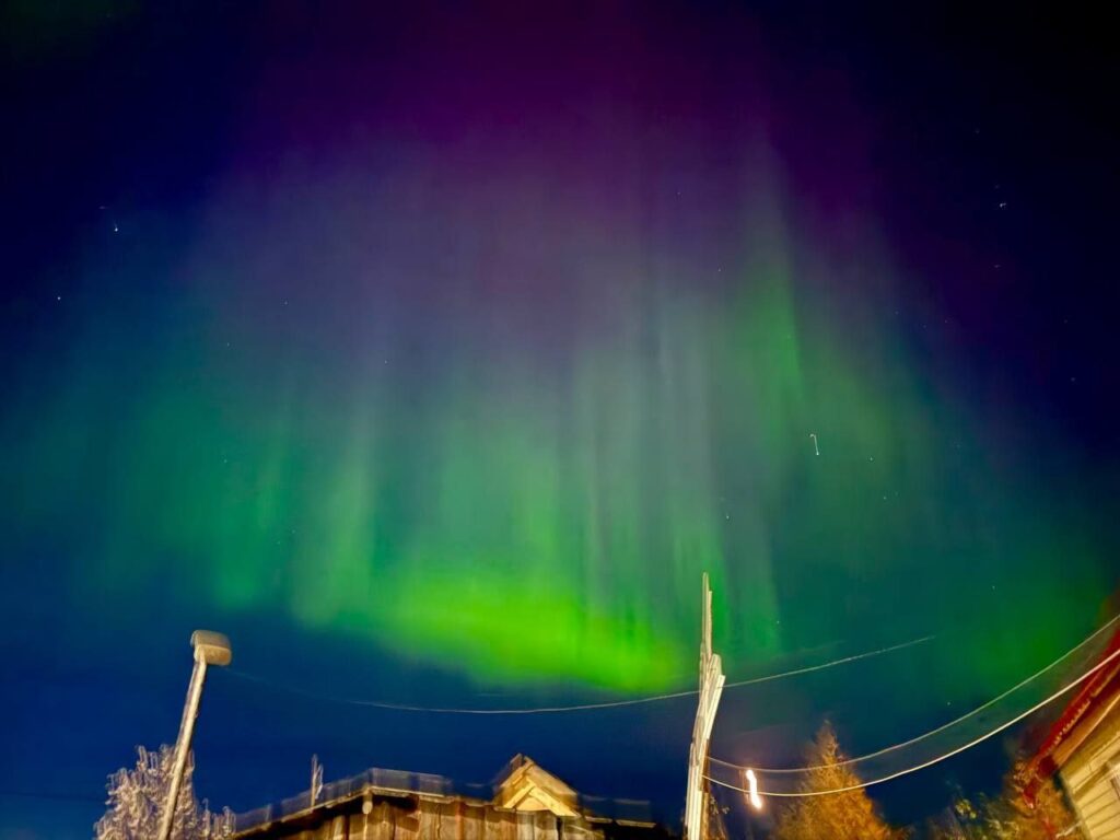 Небесное представление с фиолетовыми всполохами видели также в Верхоянске, его засняла Алена Чирикова.