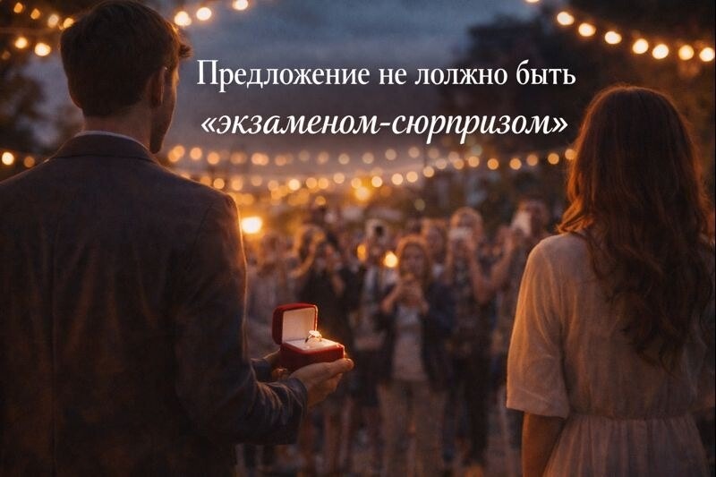 Если вы вообще не говорили про будущее, про брак, про детей, про ценности — предложение превращается в лотерею. Для человека это может быть не радость, а шок: «Меня сейчас ставят перед сценой и ждут правильный ответ».