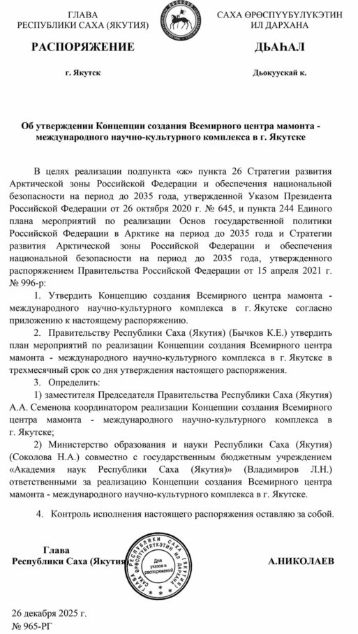 Хотим обрадовать Распоряжением по утверждению Концепции создания Всемирного центра мамонта, которое вышло в прошлую пятницу 26.12.2025 года за подписью А.С. Николаева.