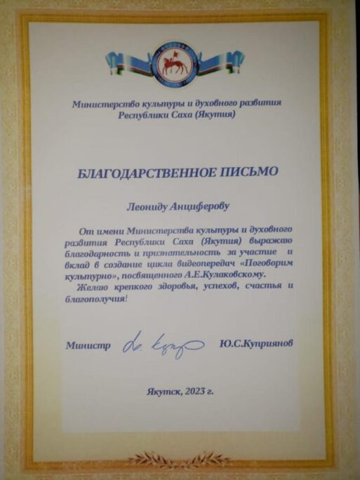 Благодарственное письмо Министерства культуры РС(Я) за участие и вклад в создание цикла видеопередач «Поговорим культурно», посвященных А.Е. Кулаковскому, вручена артисту Симфонического хора Филармонии Якутии Леониду Анциферову.