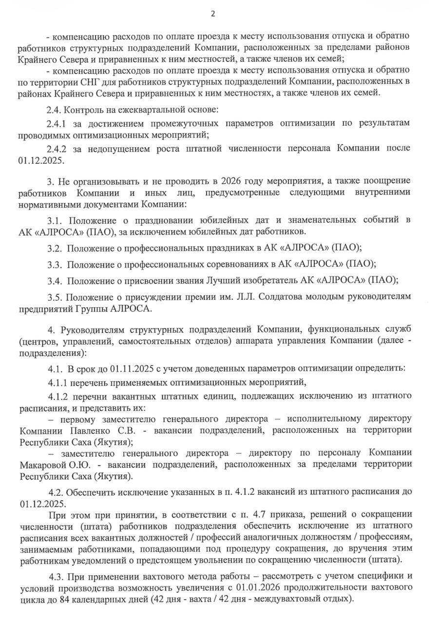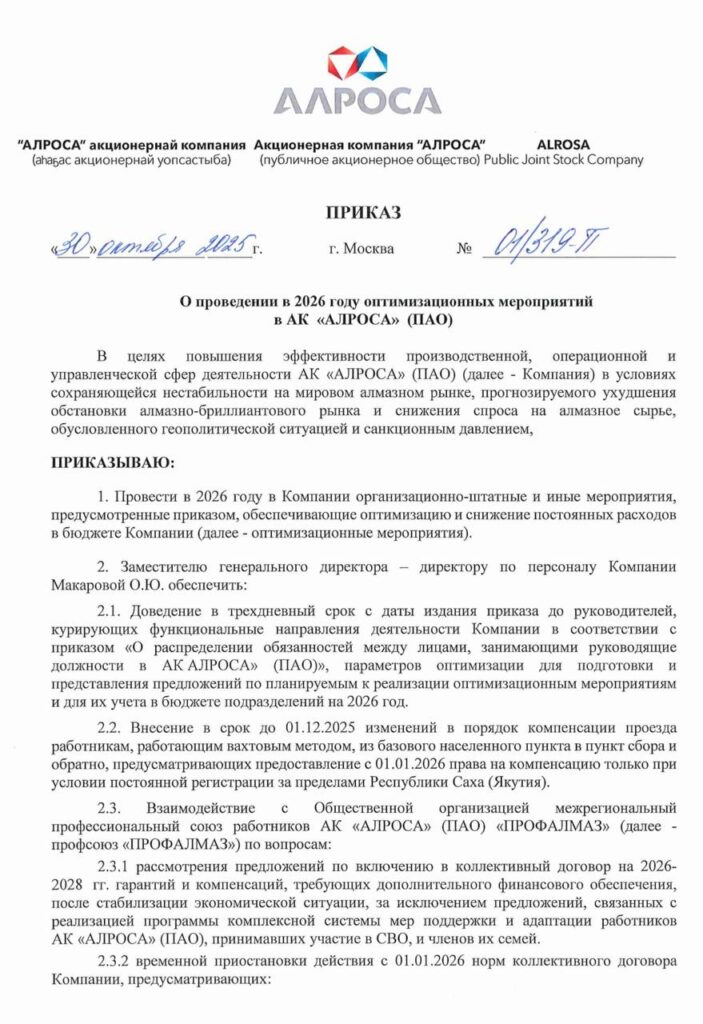 Если приказ настоящий, то значит алмазодобывающая компания начала готовиться к тяжелому 2026 году.