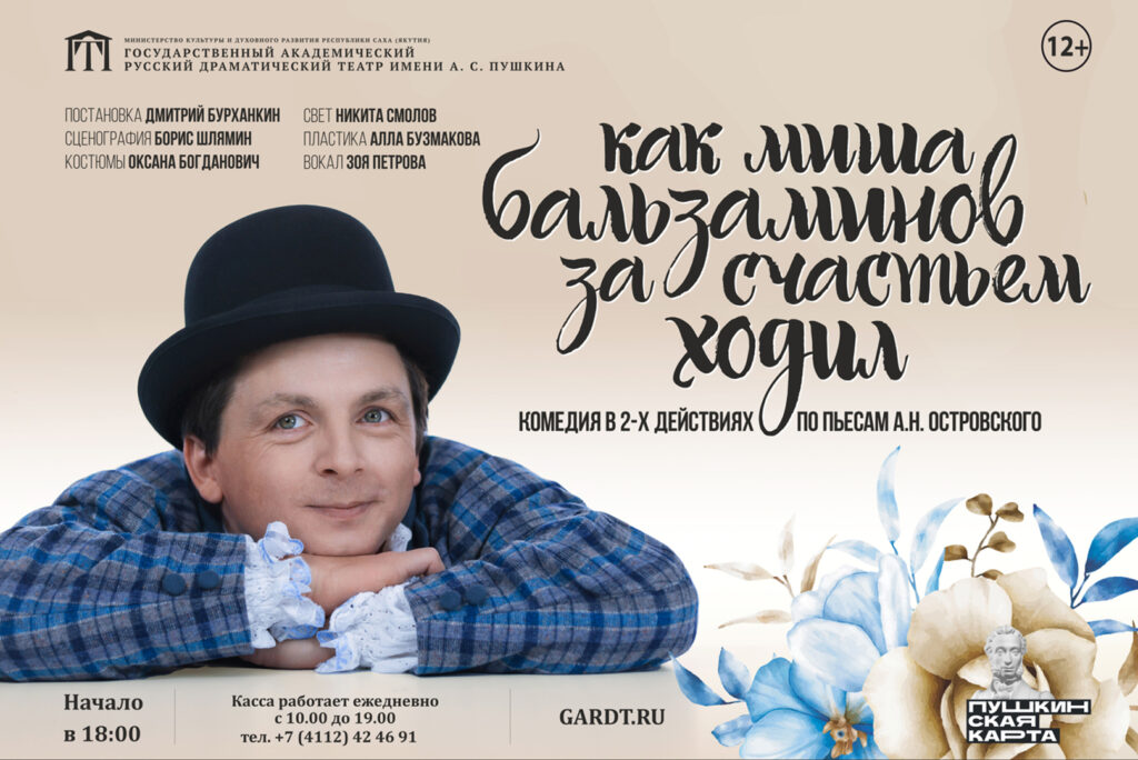 В этот день в Русском театре им. А.С. Пушкина сыграют ироничную трагикомедию, трогательную историю маленького человека Миши Бальзаминова в постановке Дмитрия Бурханкина — «Как Миша Бальзаминов за счастьем ходил» по трем известным пьесам Александра Островского о приключениях Миши Бальзаминова.