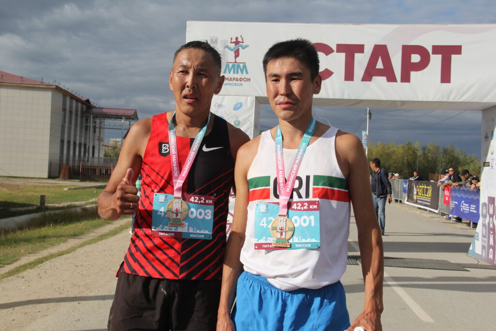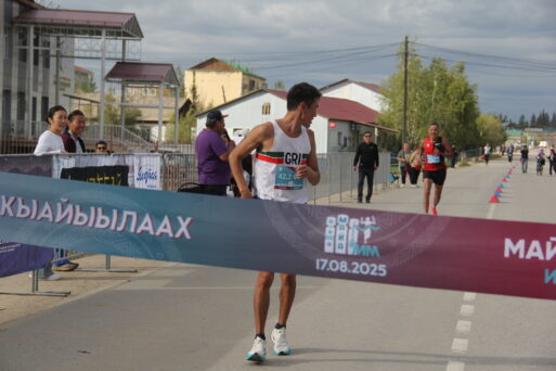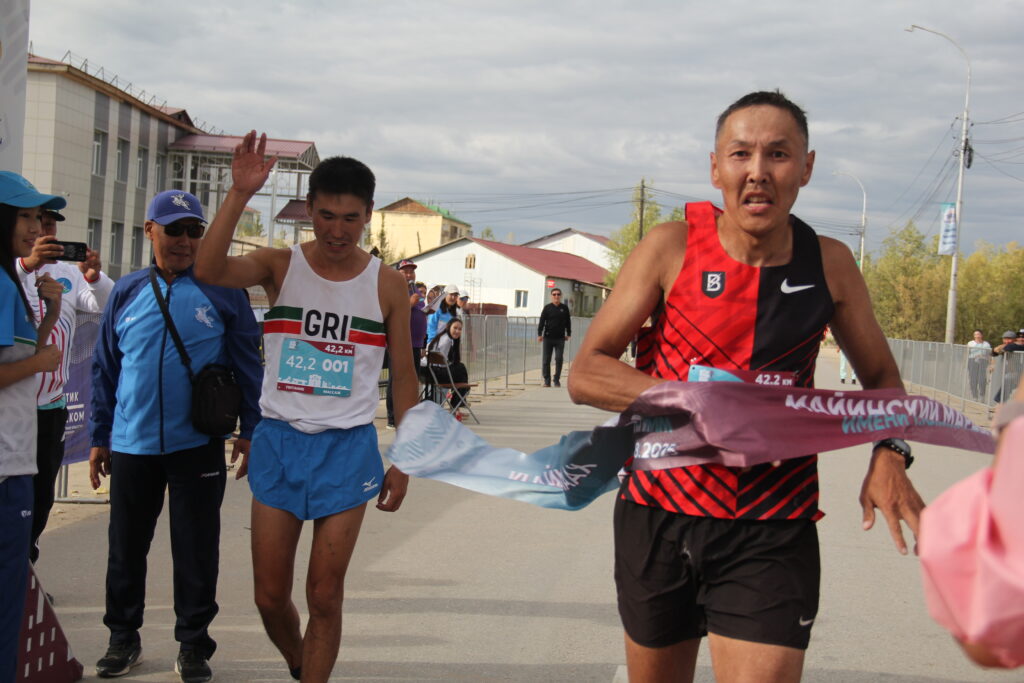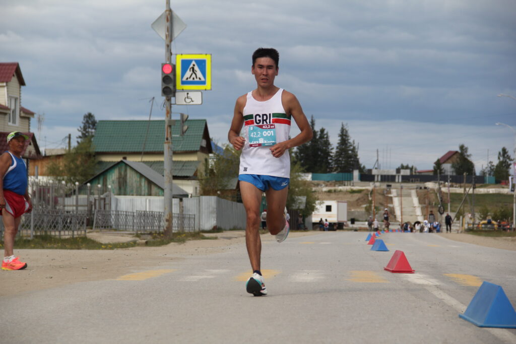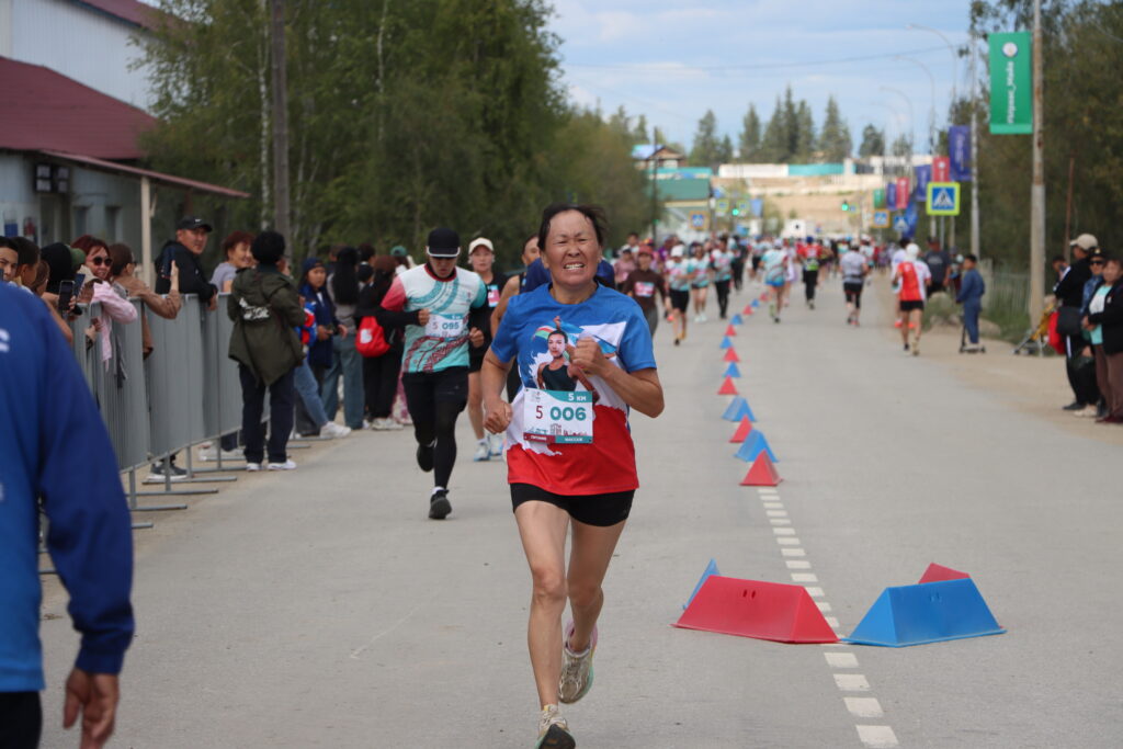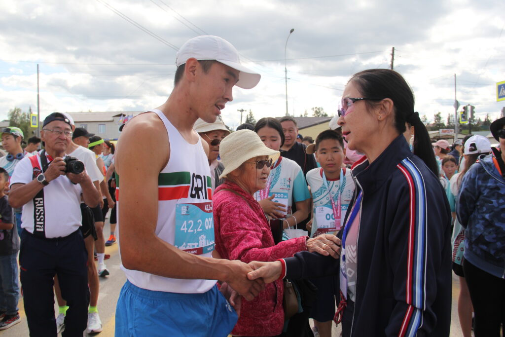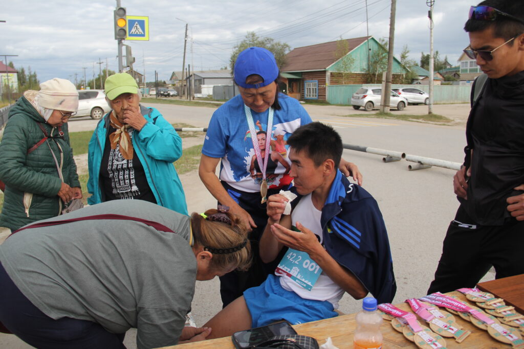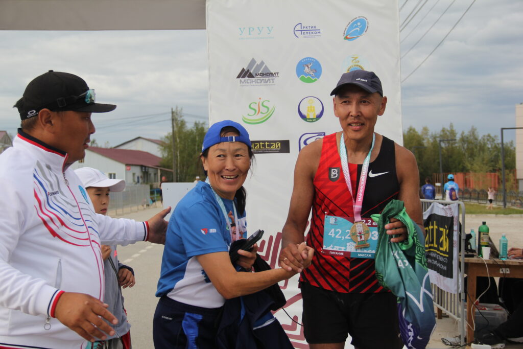 Между тем, на марафонской дистанции произошли несколько неординарные события. Так, многие считали, что победителем среди мужчин станет Константин Драгунов (стартовый номер 001), уроженец мегинской земли, представитель беговой семьи, старший сын известной легкоатлетки Екатерины Драгуновой. К слову, на дистанции 5 км среди мужчин (!) победителем стал его младший брат, Эрчимэн (18 мин. 28,814 сек). В забеге на дистанции 1000 м также участвовал и Мичил, четвертый сын спортивной семьи и борец по “основной специальности”, к сожалению, стал четвертым. Сама Екатерина (№ 006) победила в беге на 5 км в группе женщин 51-60 лет (22 минуты 24,815 сек) и показала третий результат в абсолютном первенстве среди женщин.