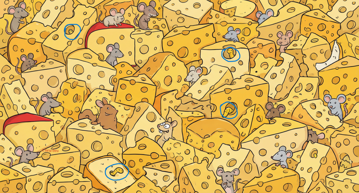 В кладовке с сырами у грызунов наметилась неплохая вечеринка. Но поживиться молочным пришли не только они. Ваша задача — найти червячка за 10 секунд! Подсказка: их тут 4.