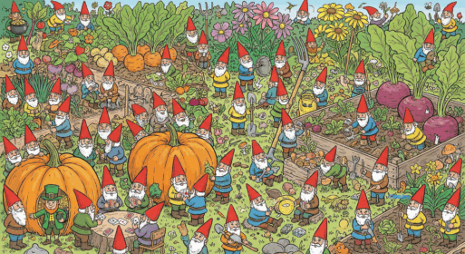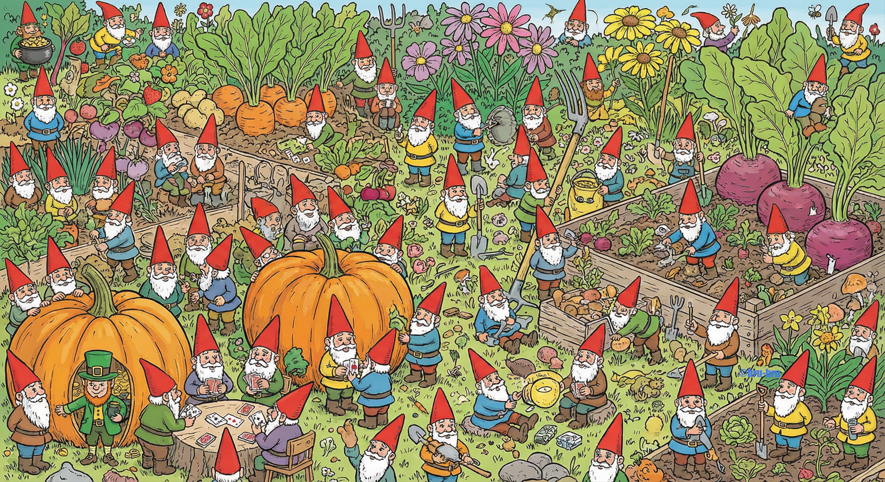 Перед нами летняя картина с садовыми гномами. Кто-то работает, а кто-то отлынивает, играя в карты. Сможете найти пчёлку за 10 секунд? Время пошло!