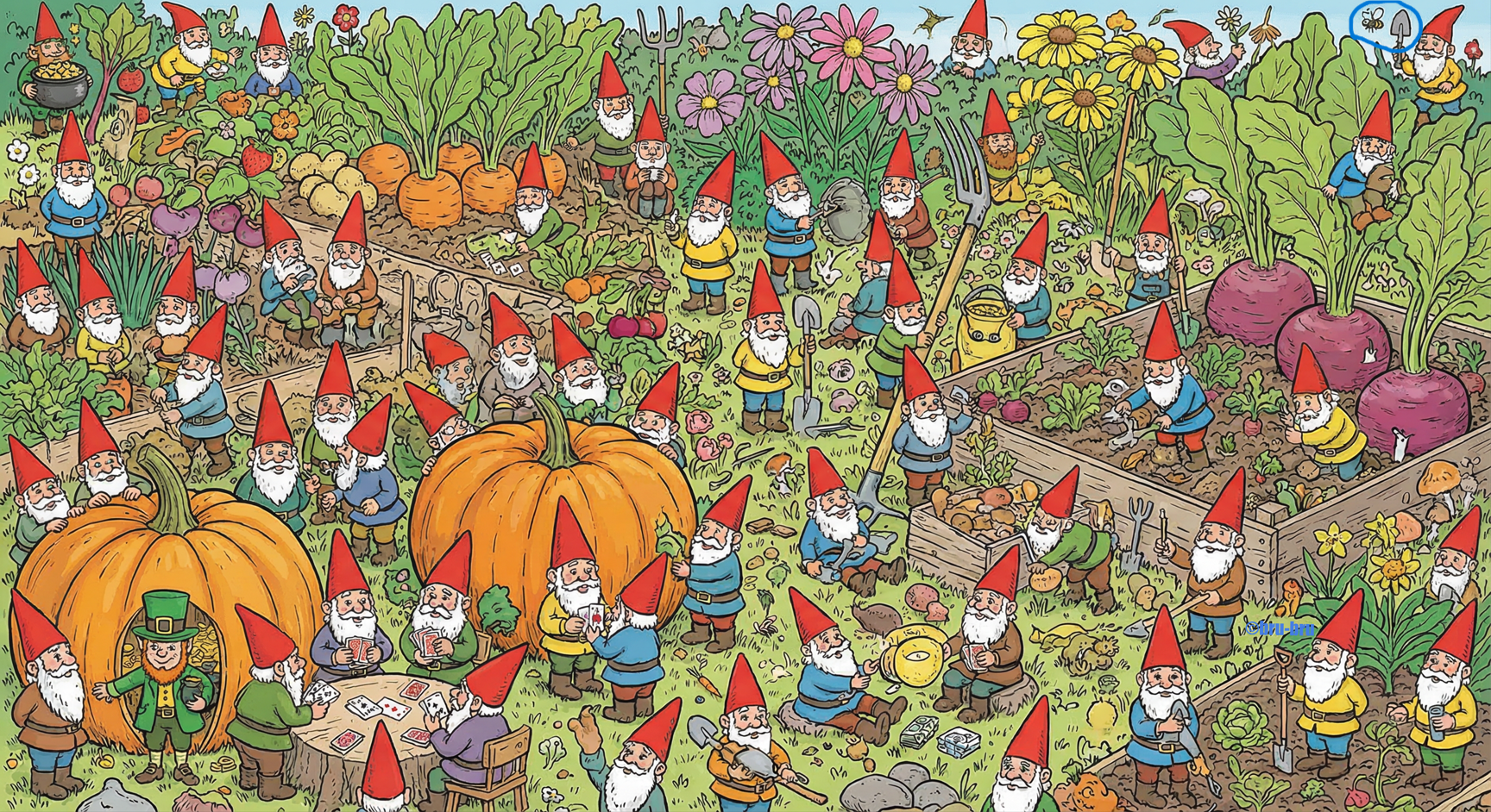 Перед нами летняя картина с садовыми гномами. Кто-то работает, а кто-то отлынивает, играя в карты. Сможете найти пчёлку за 10 секунд? Время пошло!