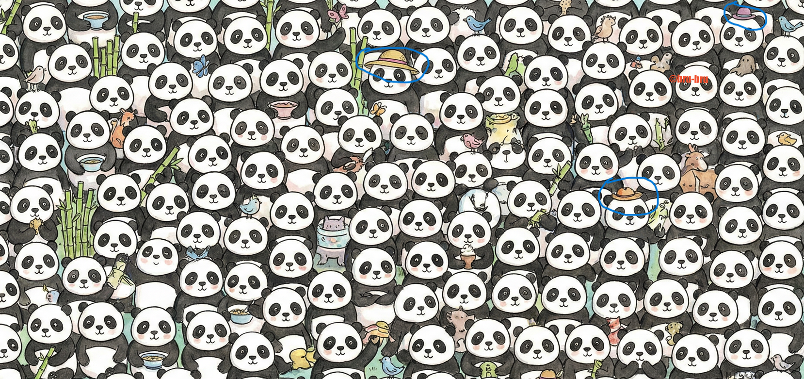 Как будто все панды мира собрались на одной картинке. Ваша задача — найти все шляпки. Справитесь за 10 секунд?