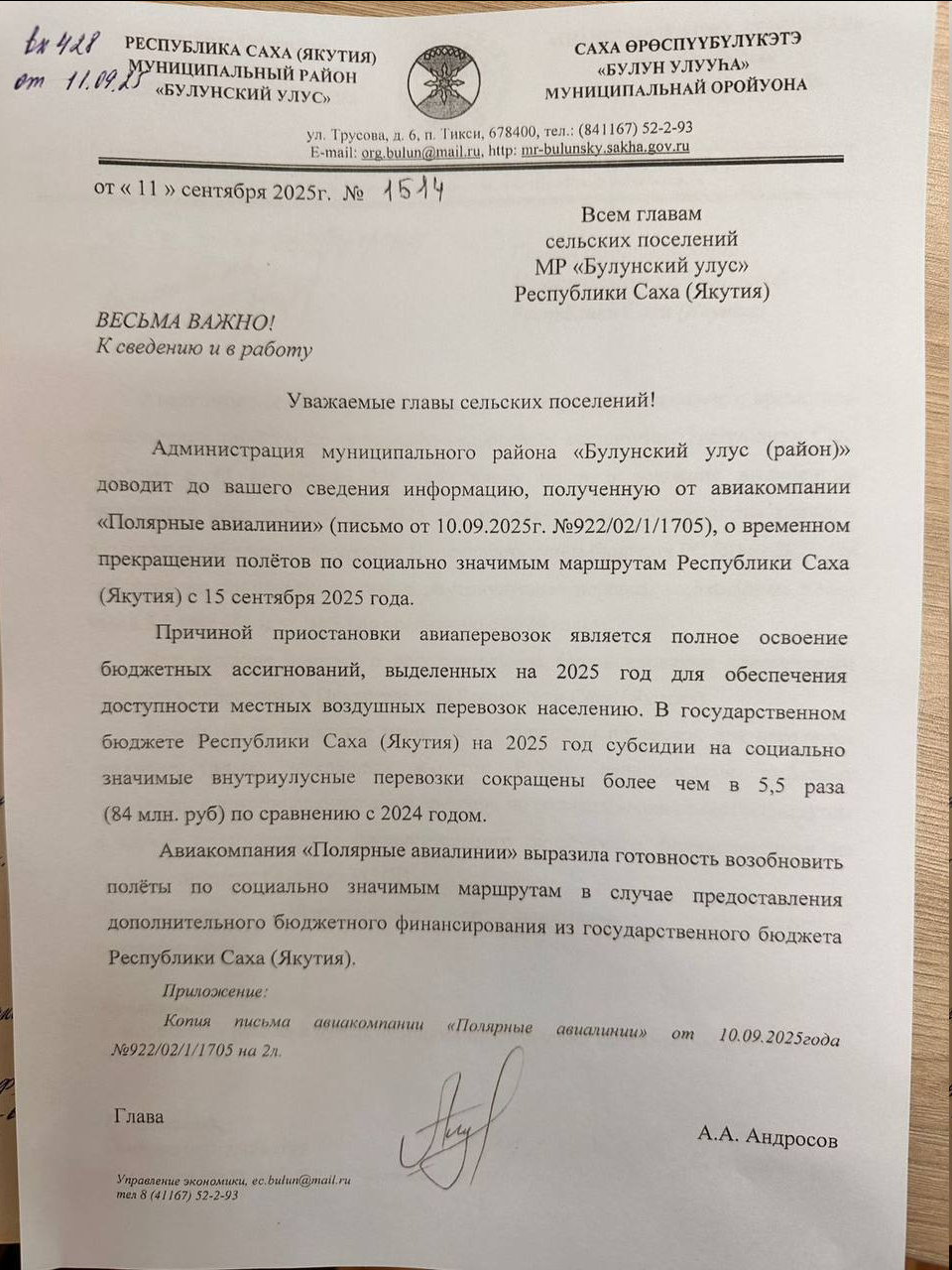 Теперь к нам обратились жители Булунского района. Они тоже бьют тревогу из-за отмены авиаперевозок по социально значимым внутриулусным маршрутам.