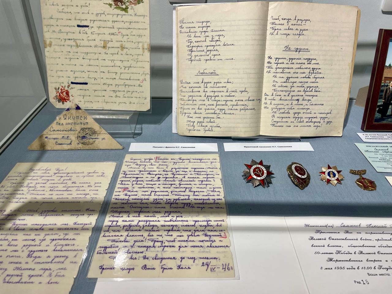На выставке «Человек-легенда» показаны военные реликвии – фронтовые письма, фронтовой рукописный песенник, документы, награды и основные научные труды профессора Н. Г. Самсонова.