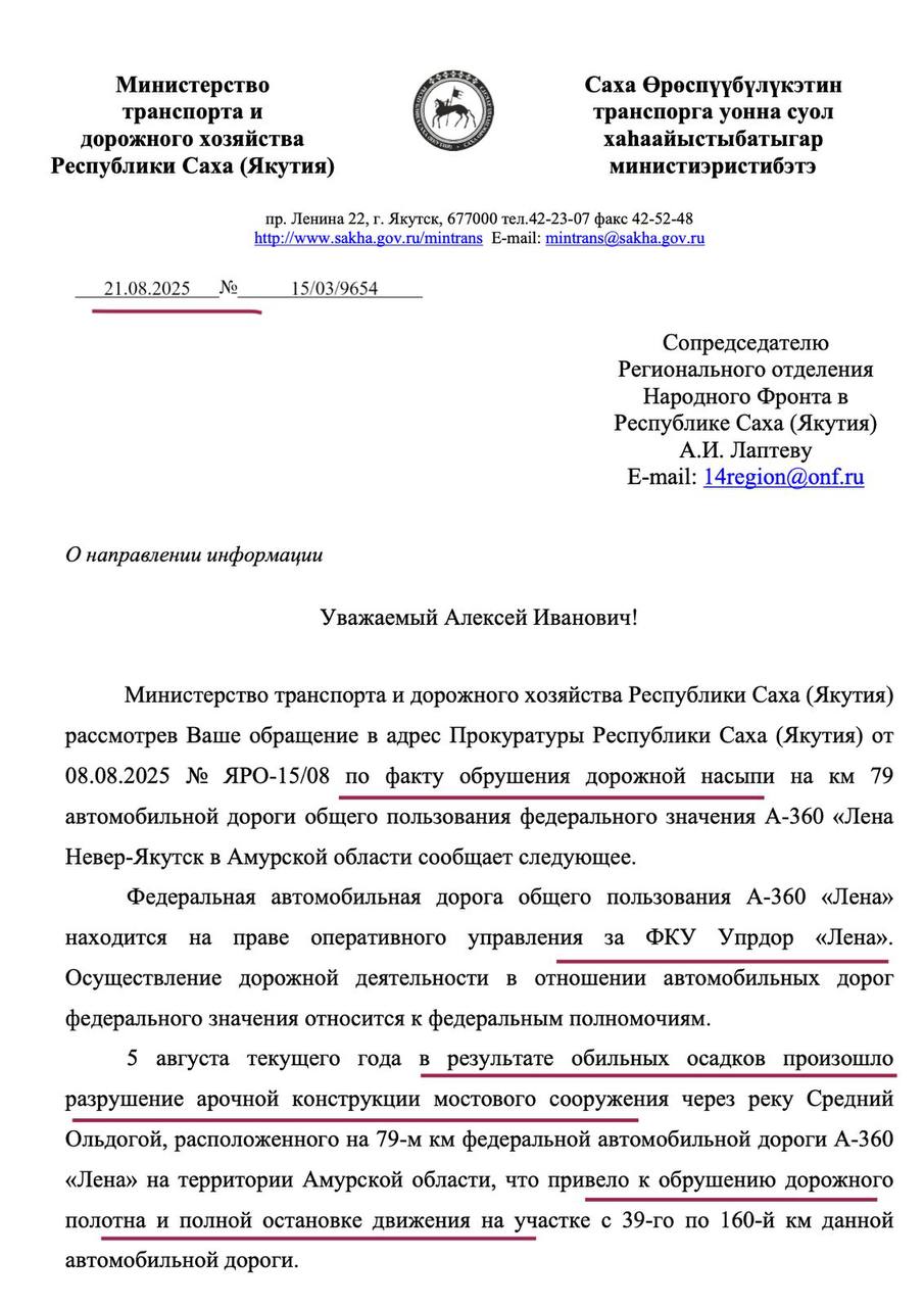 После того, как 5 августа на участке федеральной трассы А-360 «Лена» произошел обвал дорожного полотна, что привело к парализации движения авто, сопредседатель Народного фронта в Якутии Алексей Лаптев направил запрос в Минтранс Якутии, чтобы выяснить каковы истинные причины данной аварии, учитывая, что за содержание этой дороги отвечает хоть и федеральное учреждение ФКУ Упрдор «Лена» (Бубнов Алексей), но расположенное в Алданском районе Якутии, пишет Торбозне радио