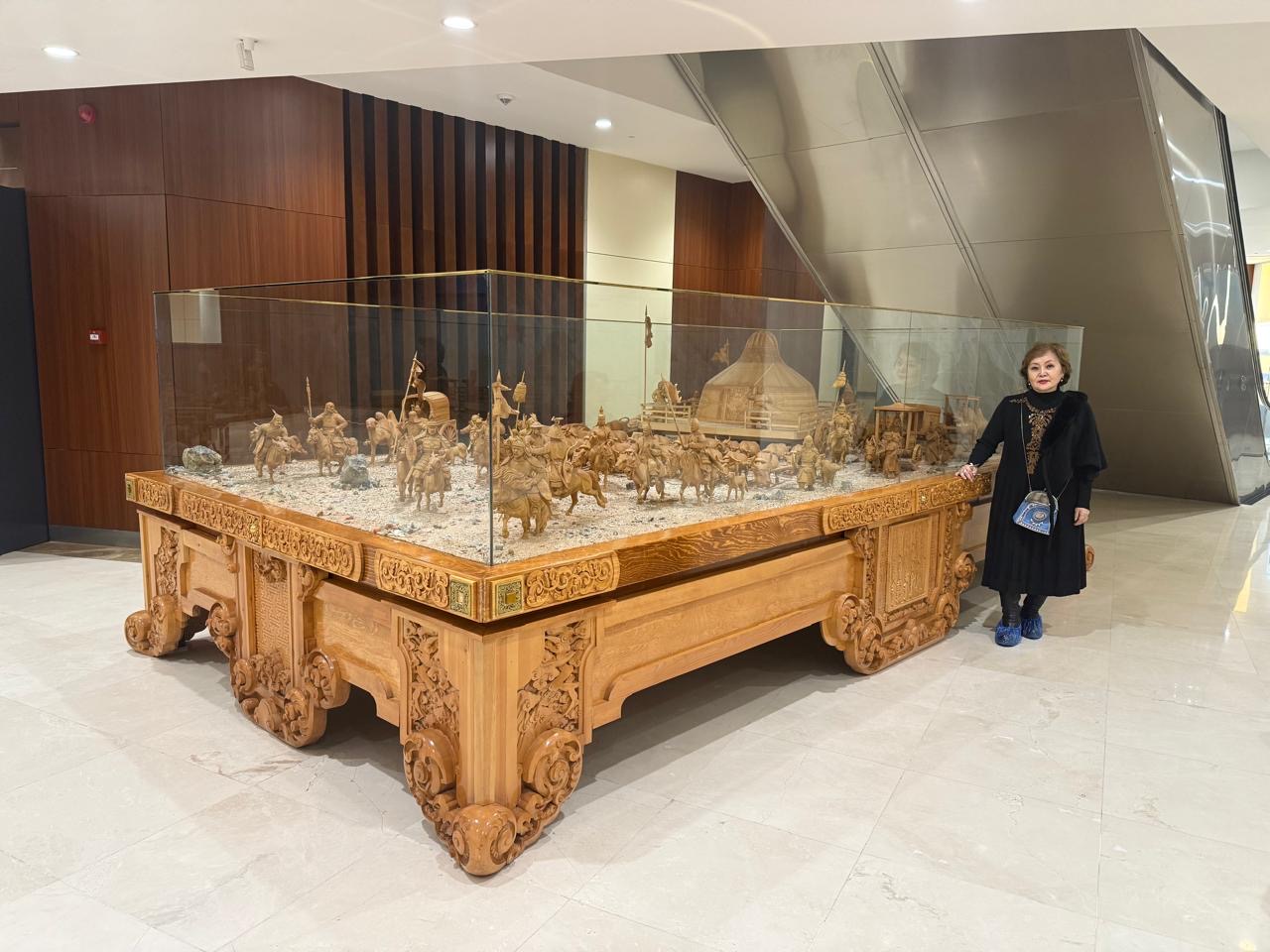 Действительно музей оказался весьма величественным местом. Примечательна уже центральная входная зона, которая представлена великолепно-красивыми высоченными дверьми — воротами. Эти двери украшены золочеными круглыми «навершиями», на которых изображены сцены из жизни монгол эпохи Чингисхана. Над этими огромными дверями имеется украшение — некий десюдепортс символиками и узорами того времени. А внутри — огромные площади музея, заполненного прекрасно-замечательными экспонатами и артефактами, повествующими об удивительной эпохе завоевателя, великого полководца и стратега, я бы сказала даже, великого комбинатора всех времен и народов, величайшего сына монгольского народа Чингисхана.