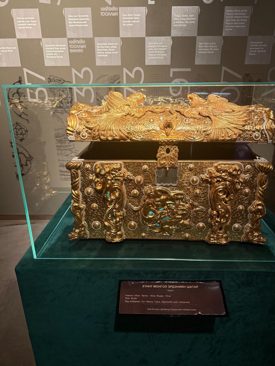 Действительно музей оказался весьма величественным местом. Примечательна уже центральная входная зона, которая представлена великолепно-красивыми высоченными дверьми — воротами. Эти двери украшены золочеными круглыми «навершиями», на которых изображены сцены из жизни монгол эпохи Чингисхана. Над этими огромными дверями имеется украшение — некий десюдепортс символиками и узорами того времени. А внутри — огромные площади музея, заполненного прекрасно-замечательными экспонатами и артефактами, повествующими об удивительной эпохе завоевателя, великого полководца и стратега, я бы сказала даже, великого комбинатора всех времен и народов, величайшего сына монгольского народа Чингисхана.