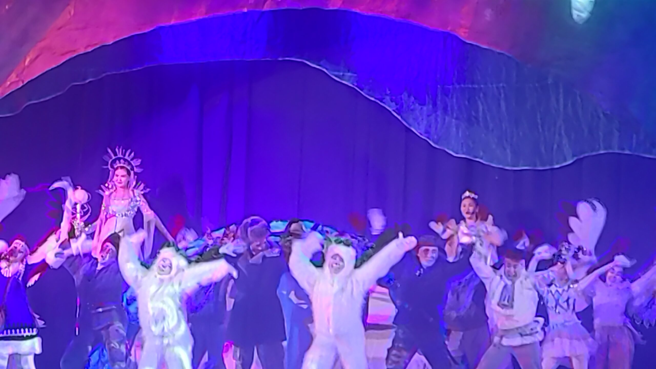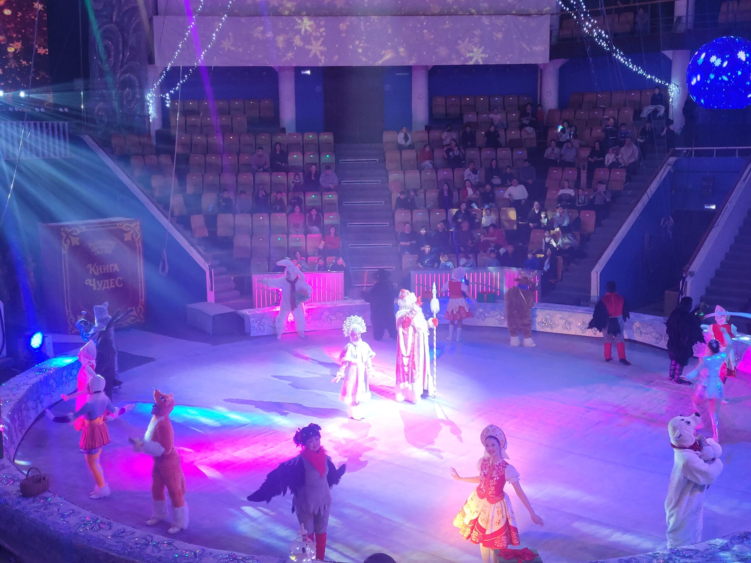4-е место: цирковое представление «Книга чудес» Государственного цирка Якутии (diamond—circus.ru) — сказочная история о спасении Снегурочки от козней Кащея мальчиком Ваней, который вместе с Волком отправляются через Ледяное царство, по пути встречая Жар-птицу, Мамонта с мамонтенком, разбойников (режиссер постановщик Фекла Попова-Колесова). Новогодний сюжет был вплетен в цирковую канву представления – воздушные гимнасты на кольцах и полотнах сменяются акробатами, жонглерами, канатоходцами, выступлениями дрессированных животных, балета и оркестра цирка, студии «Арктик цирк». Мне показалось, что сказочная фабула несколько контрастировала с конкретной спецификой циркового жанра, основанного прежде всего на физической выносливости, силе и сноровке цирковых артистов. Им некогда было думать о драматической достоверности воплощаемых образов, выглядевших стандартно и привычно. Представление шло с полной озвучкой реплик героев циркового ревю.