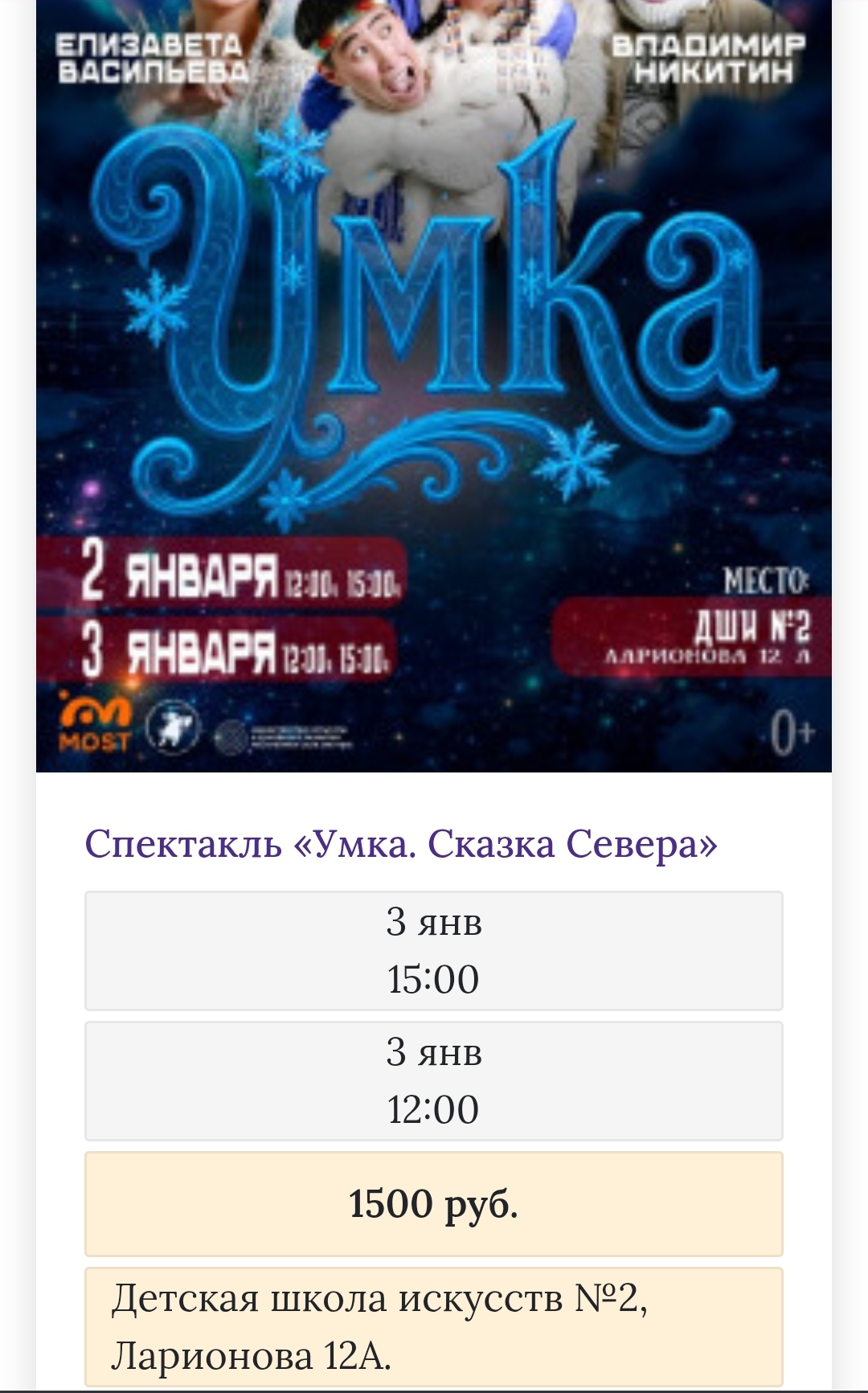 (режиссер Владимир Николаев, музыка Александра Константинова — Аямат, автор песен Климент Черемкин) — это отнюдь не воссоздание сюжета всем известного советского мультфильма, а повествование о приключениях маленького медвежонка (в переводе с чукотского языка «умка» означает «белый медведь»), которого от злых браконьеров спасают брат и сестра Мичийэ и Элкэн и их друзья — птицы и животные северного края. Действие динамичное — с песнями, танцами, музыкальными номерами, побуждающее детей разных возрастных категорий сопереживать судьбе Умки и в итоге общими усилиями вырвать его из лап охотников. Постановка — о необходимости жить в гармонии с красивой, но такой хрупкой природой родного края, о важности воспитании экологического сознания юных якутян. Понравился интерактив с детьми и их родителями вокруг елки в фойе ДШИ 2, где шли новогодние показы ТКМНС. Вместе со всем известными песнями как «В лесу родилась елочка» звучали народные мелодии и запевы традиционных круговых танцев – чем не хоровод?