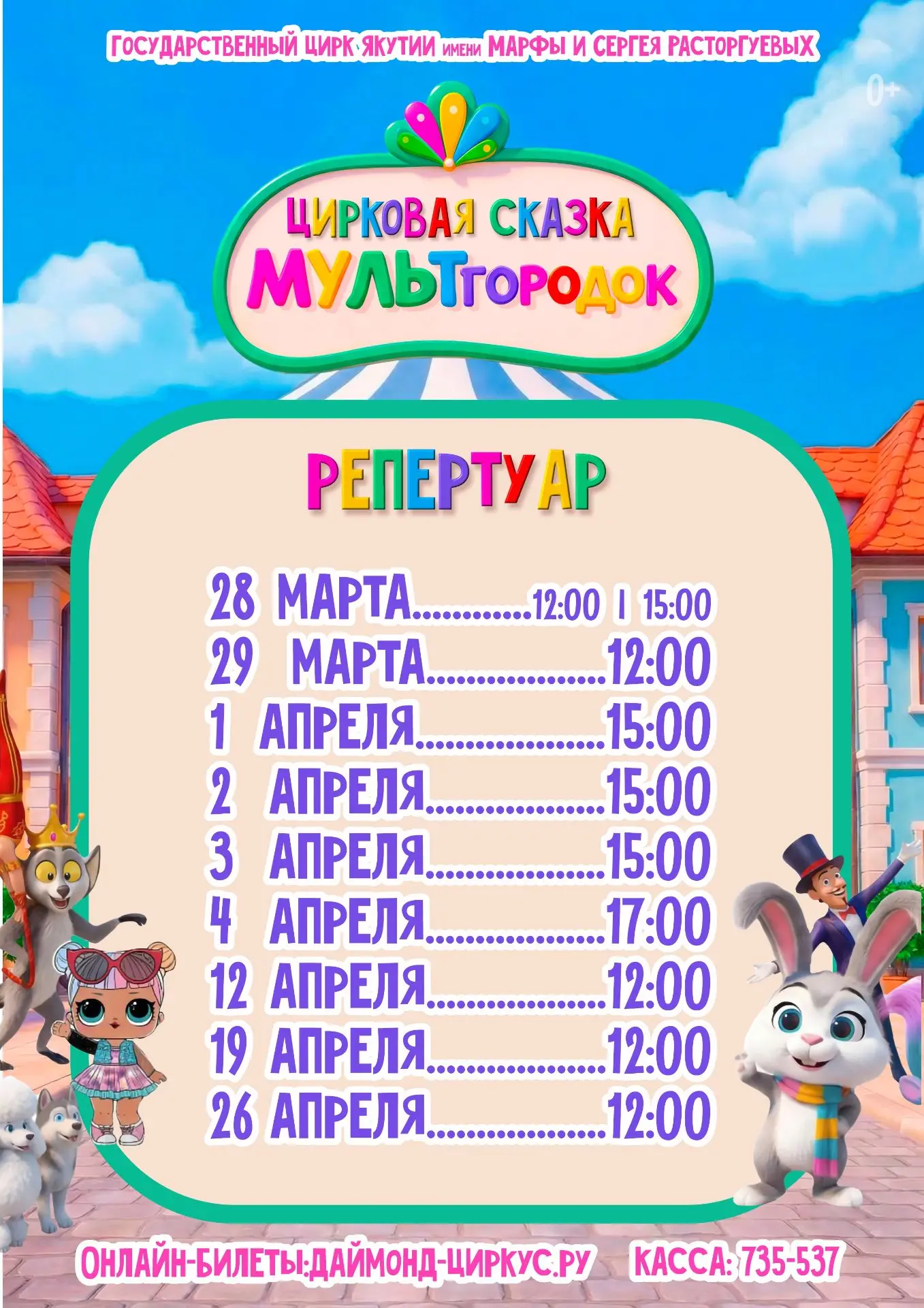 В дни долгожданных весенних каникул Государственный цирк Якутии приглашает вас в невероятный «МУЛЬТгородок», где царит сказочная, полная приключений и неожиданностей атмосфера, где герои популярных и любимых мультфильмов сойдут с экранов на арену цирка, чтобы подарить вам море ярких эмоций и незабываемых впечатлений. Вы увидите увлекательную историю, в которой произойдет множество событий с жителями «МУЛЬТгородка» — персонажами очень известных анимационных историй. И в конце, конечно же, добро победит зло.