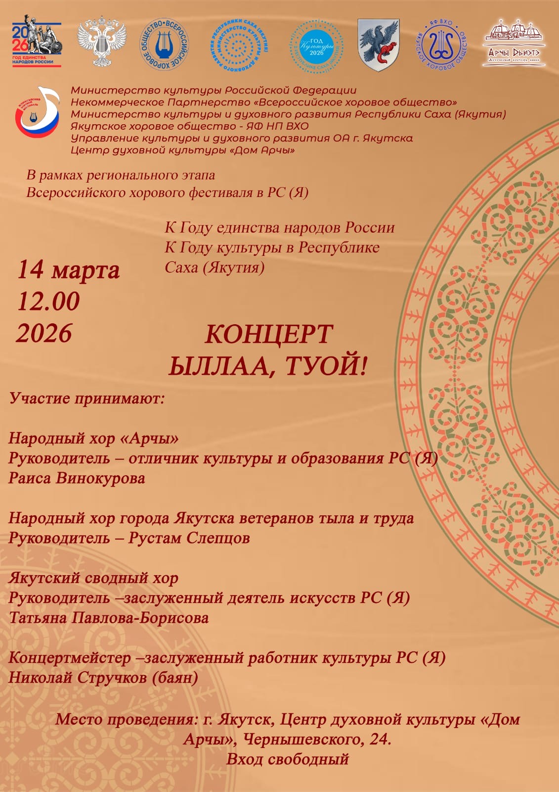 20-летнему юбилею народного хора «Арчы» (руководитель: отличник культуры и образования РС (Я) Раиса Винокурова) приурочена презентация- концерт «Кургуом ырыа тумэ кууhэ», на котором будет представлена книга о данном коллективе под названием «Хором едины».