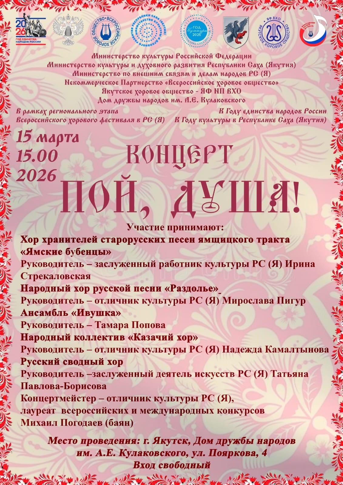 Конкурсные прослушивания очных участников пройдут на базе Центра духовной культуры Дома «Арчы» и Дома дружбы народов им А.Е. Кулаковского и завершатся концертными программами Якутского и Русского сводных хоров, концертмейстерами которых выступят известные баянисты — заслуженный работник культуры РС (Я) Николай Стручков и лауреат Всероссийских и Международных конкурсов Михаил Погодаев.