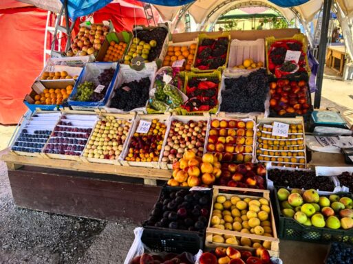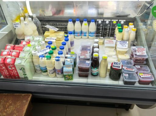 На малом базаре пока что не так много местных овощей, ожидают поступление к сентябрю. Большой выбор полуфабрикатов и молочной продукции, которую привозят по вторникам. Цены на продукты: