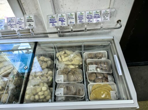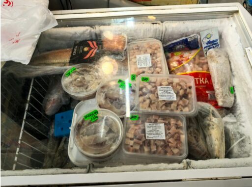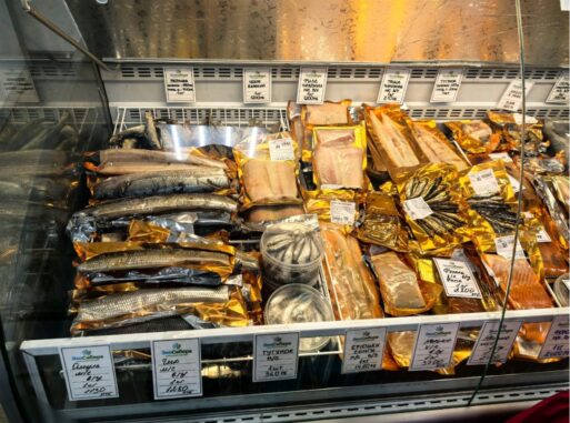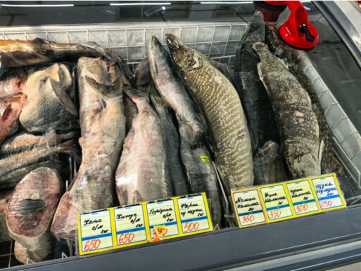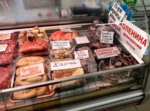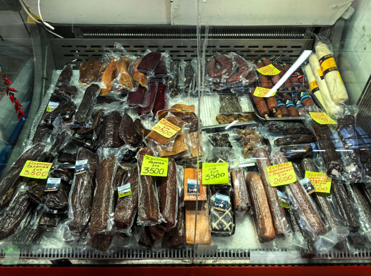 А в крытых ларьках — мясо и рыба: свежая говядина, жеребятина из Татты, Мархи и Мегино-Кангалас, а в большом павильоне можно найти и чурапчинскую телятину. Рыбные ряды предлагают свежих карасей, копченые и соленые деликатесы.