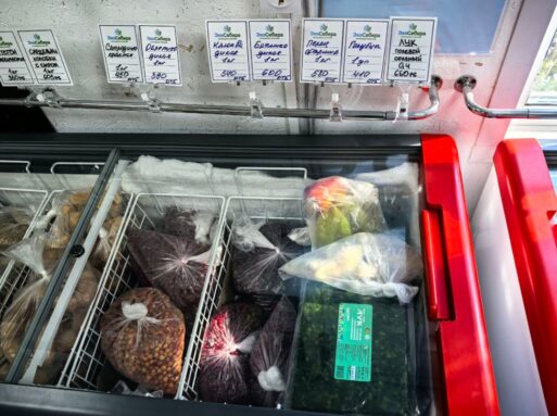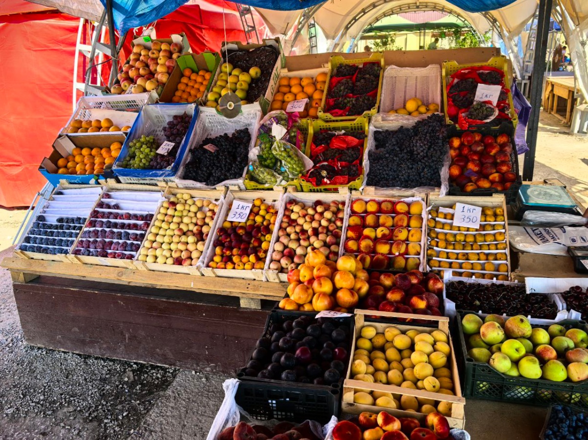 На крестьянском рынке прилавки пестрят фруктами: сладкие дыни и сочные персики из Узбекистана, яблоки и груши из Китая. Рядом — местные овощи, выращенные в Табаге и Тулагино, в том числе знаменитые саюри: капуста, огурцы, помидоры и даже перцы.