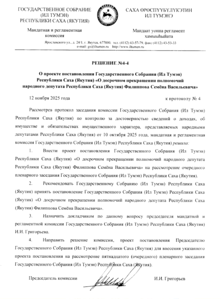 Мандатная комиссия Ил Тумэна 12 ноября рекомендовала депутатам досрочно лишить Филиппова депутатских полномочий.
