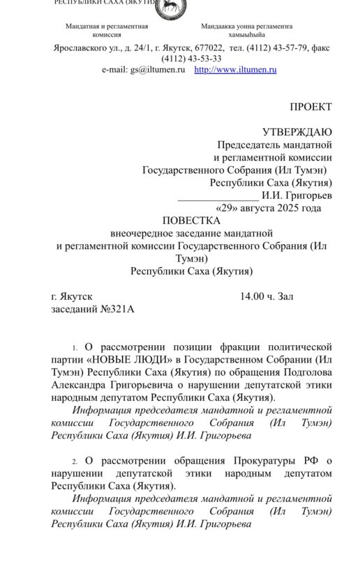 — По первому вопросу о нарушении депутатской этики выяснилось, что фракция «Новые люди» свою позицию так и не сформировала, их представители отсутствовали. Комиссия была вынуждена установить новый срок — до 15 сентября — и обратиться уже к республиканскому руководству партии.
