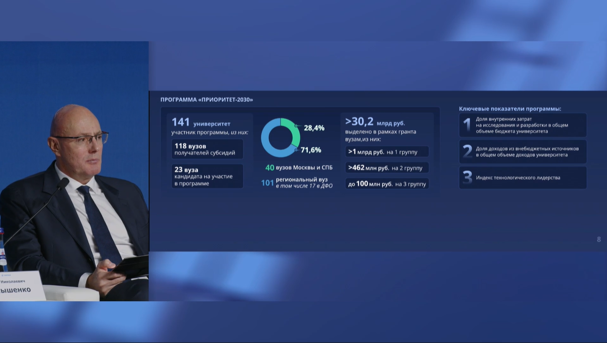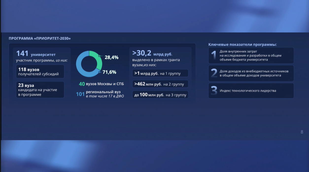 Программа «Приоритет-2030» стартовала в 2021 году по инициативе Минобрнауки России. В феврале 2024 года Президент Владимир Путин в послании Федеральному Собранию отметил, что программа будет продлена. На реализацию программы Правительством было выделено 144 млрд рублей. За 5 лет университеты привлекли от индустрии и бизнеса 196,8 млрд рублей, 19,9 млрд рублей вложили регионы. При этом губернаторы регионов отмечают, что вузы все чаще становятся ключевыми участниками социально-экономического развития субъектов.