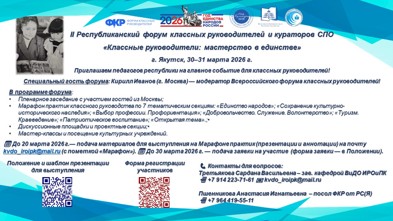30–31 марта 2026 г. АОУ РС(Я) ДПО «Институт развития образования и повышения квалификации имени С.Н. Донского – II» организует II Республиканский форум классных руководителей и кураторов СПО по теме «Классные руководители: мастерство — в единстве» очно с онлайн-трансляцией.