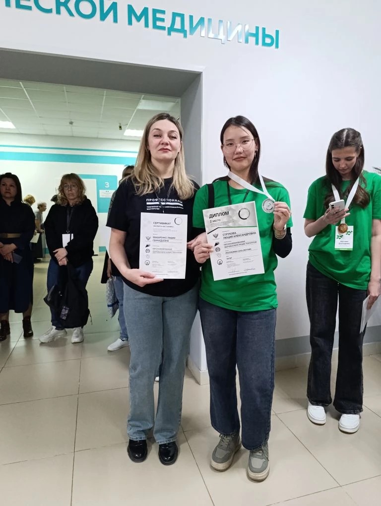 Серебряную медаль в компетенции «Персонализированные здоровьесберегающие технологии» завоевала Люция Струкова (эксперт-наставник – Лидия Геннадьевна Макаренко). В рамках чемпионатного задания Люция успешно выполнила три модуля: определение морфофизиологических особенностей организма, медико-социальную реабилитацию и «Школу здоровья». Всего в данной компетенции соревновались 10 участников из Москвы, Мурманской области, Татарстана, Тывы и других регионов.