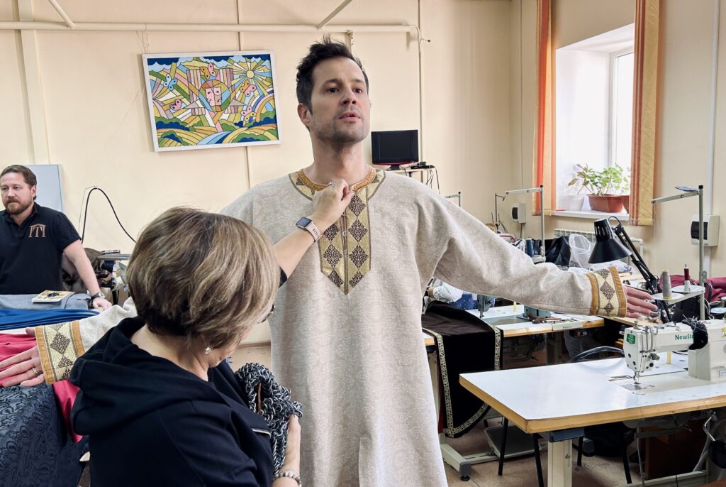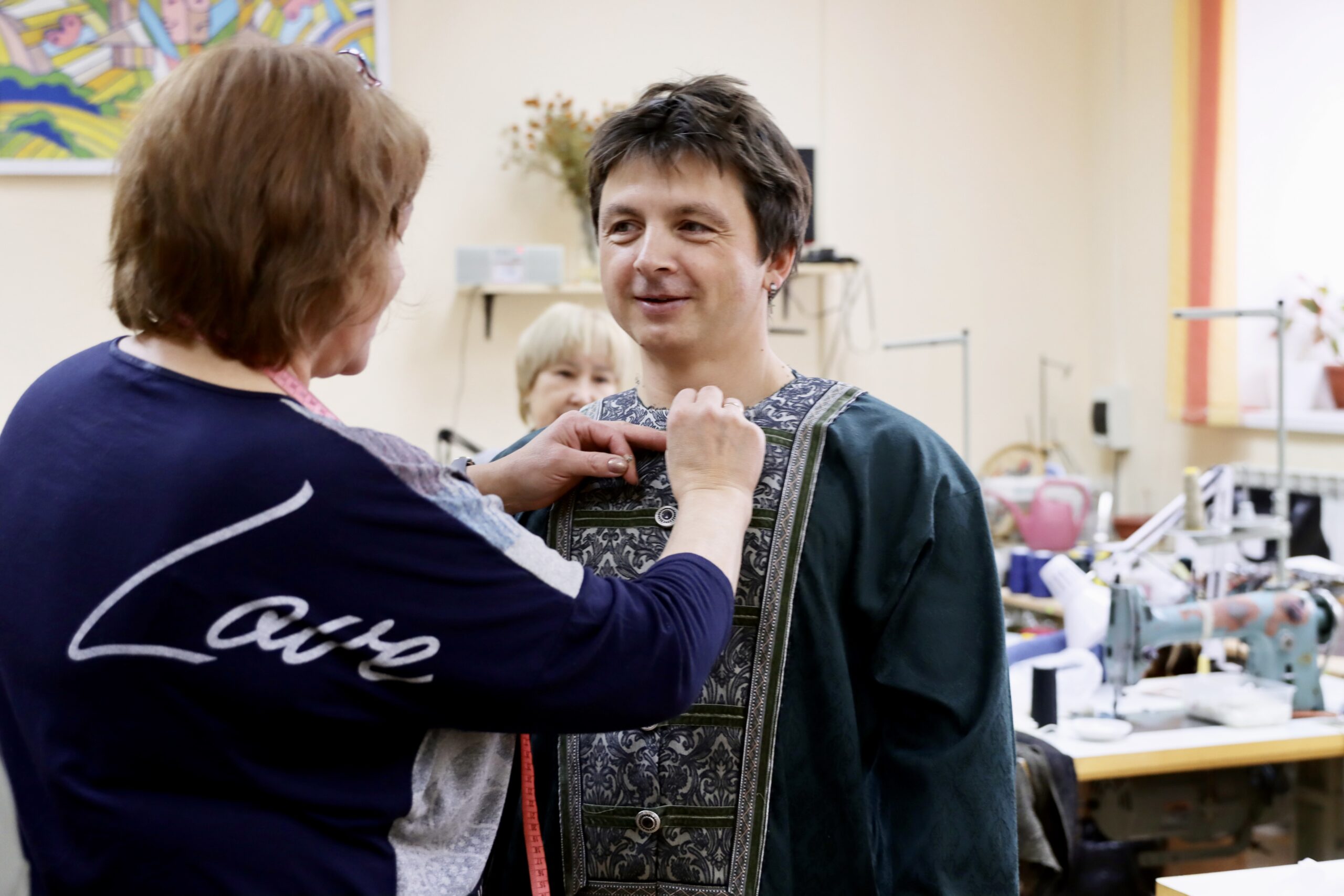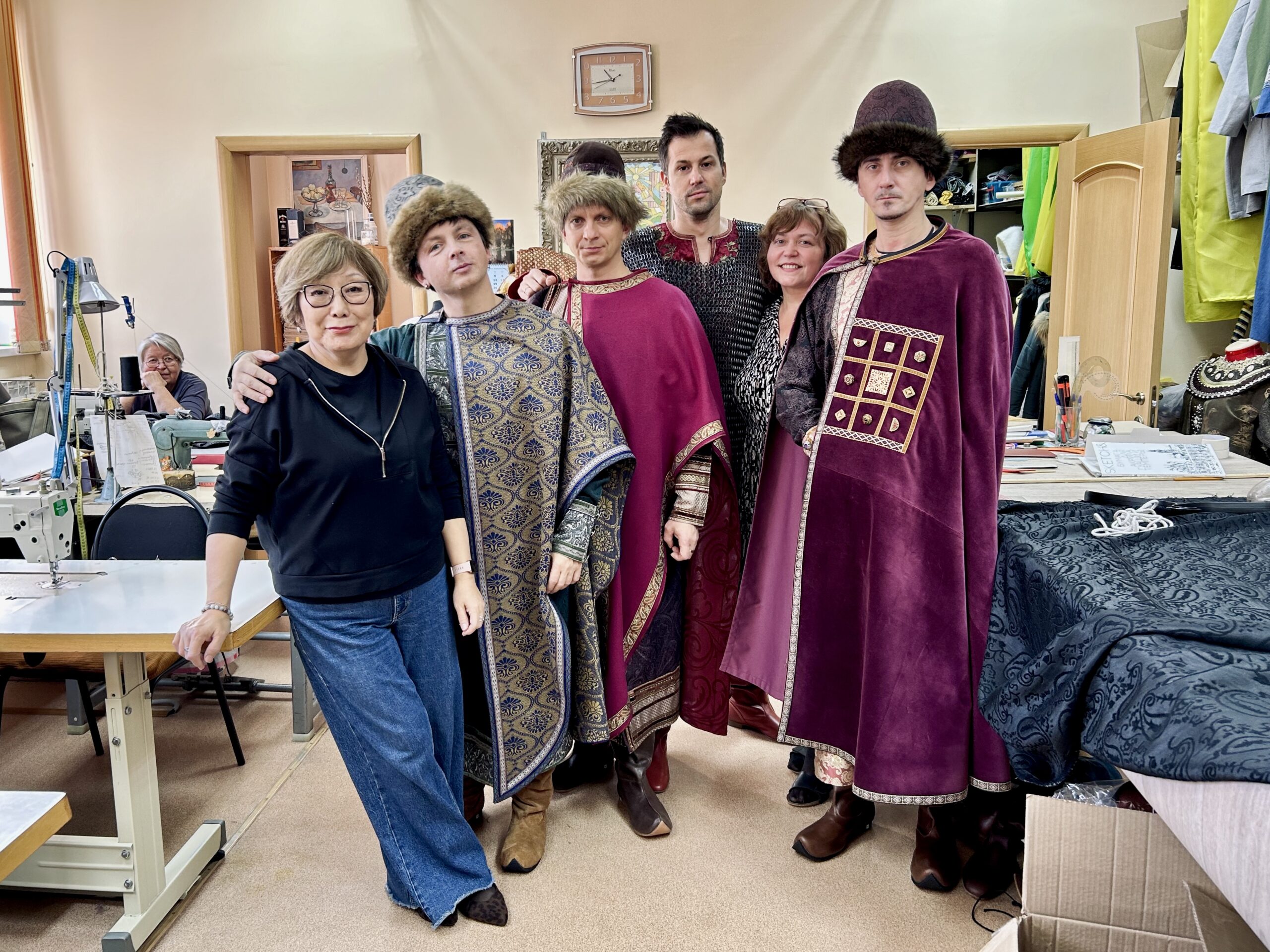 Большой объем работы был и у столярного и декорационного цехов. Массивные каркасы, обшивались фреской, которая имитирует рисунок с храма, где покоились мощи Невского. Созданы детали быта для передачи атмосферы Древней Руси.