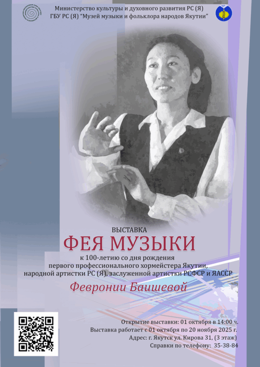 К Международному дню музыки, 1 октября Музей музыки и фольклора народов Якутии приглашает гостей и жителей г. Якутска на торжественное открытие выставки «Фея музыки», посвященной к 100-летию со дня рождения Февронии Алексеевны БАИШЕВОЙ, посвятившей всю свою жизнь на развитие музыкального искусства нашей республики, первому профессиональному хормейстеру Якутии, народной артистке РС(Я), заслуженной артистке РСФСР и ЯАССР, отличнику телевидения и радио, председателю Якутского отделения Всероссийского хорового общества.