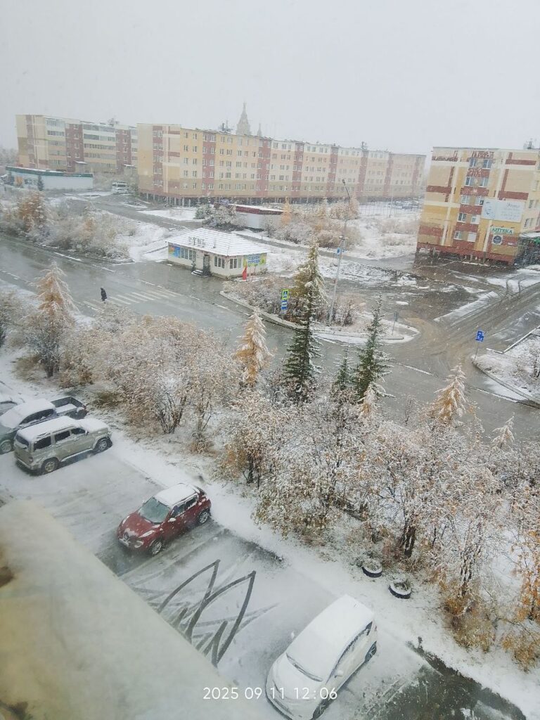 Утром 11 сентября в городе Удачный Мирнинского района выпал первый снег. Пока снег не растаял, горожане успели слепить забавного снеговика!