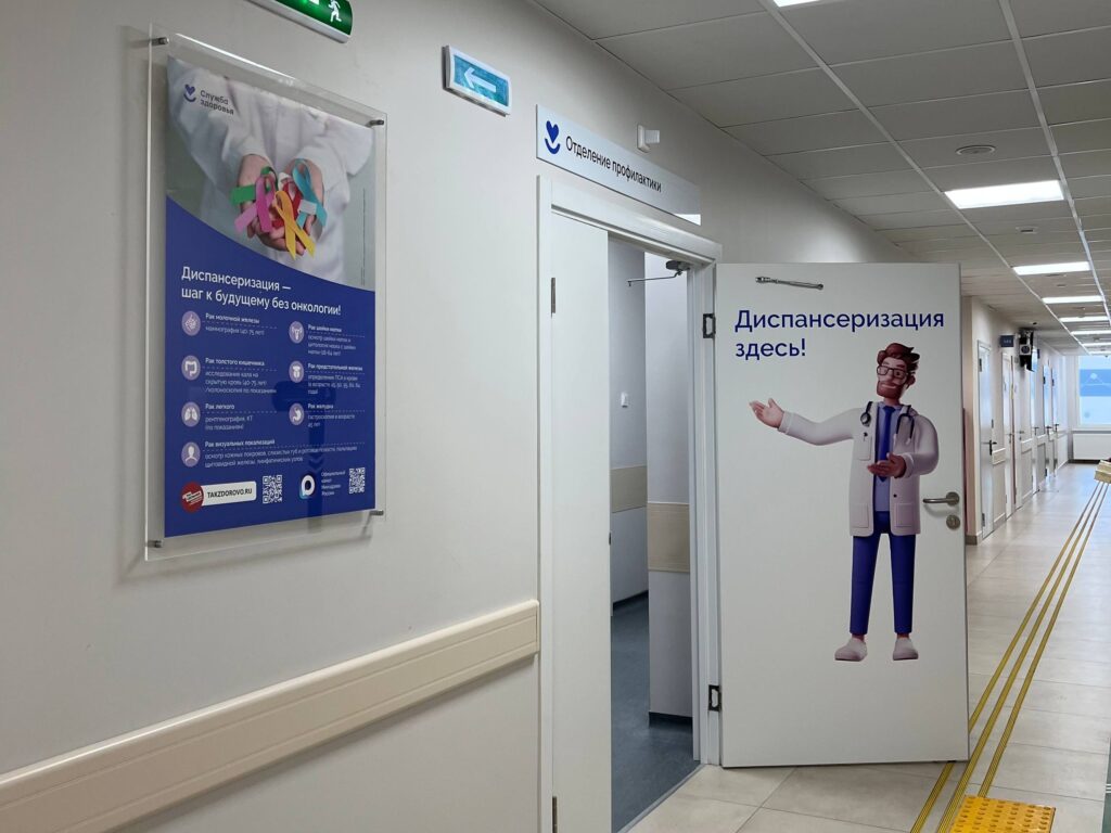 Продуманная архитектура комплекса предусматривает отдельные, логистически выверенные входы для взрослого населения, детского отделения и женской консультации. Особое внимание уделено эпидемиологической безопасности: для пациентов с признаками острых респираторных вирусных инфекций (ОРВИ) созданы изолированные входы как для взрослых, так и для детей, что минимизирует риски распространения инфекций. Внутри поликлиники внедрена интуитивно понятная система доступной навигации с интерактивными панелями. Здесь пациенты могут легко ознакомиться с информацией о сотрудниках, уточнить режим работы врачей-специалистов и диагностических кабинетов, а также самостоятельно построить оптимальный маршрут к нужному кабинету.