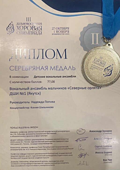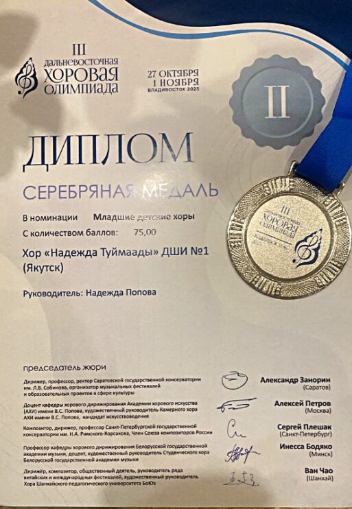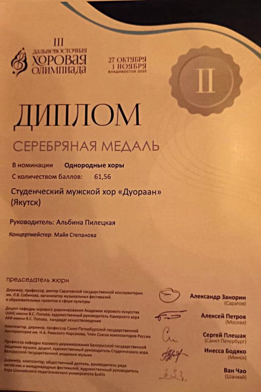 — Женский любительский хоровой коллектив «Вдохновение» из Якутска под руководством Ольги Чемпосовой (Конц-р К. Шильникова) завоевал Бронзу.