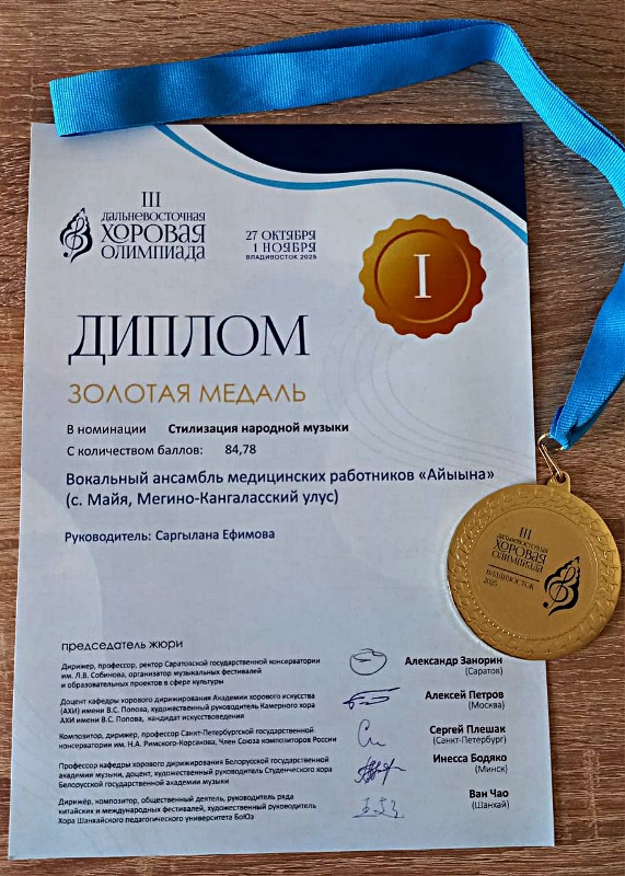 Международное жюри присудило звание Лауреата 1 степени — вокальному ансамблю медицинских работников «Айыына» (Рук. Саргылана ЕФИМОВА) в номинации «Стилизация народной музыки», звание Лауреата 2 степени «в ном. «Взрослые вокальные ансамбли» из Майи Мегино-Кангаласского улуса, а также наградило коллектив номинацией «За сохранение народных традиций».