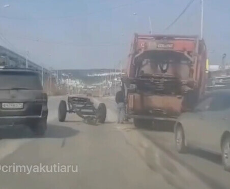 Авария на Вилюйском тракте: возле ТЦ Юнимолл у едущего Прадо оторвался прицеп и налетел на встречный мусоровоз. Видео опубликовал @crimyakutiaru