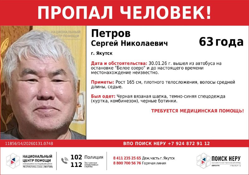 30 января, примерно с 7-8 ч. утра вышел с работы (с. Маган), сев в служебный автобус «Аэропорты Севера», доехал до Белого озера и пропал, до настоящего времени его местонахождение неизвестно.