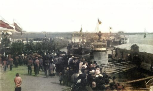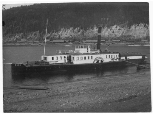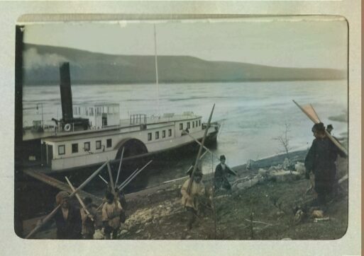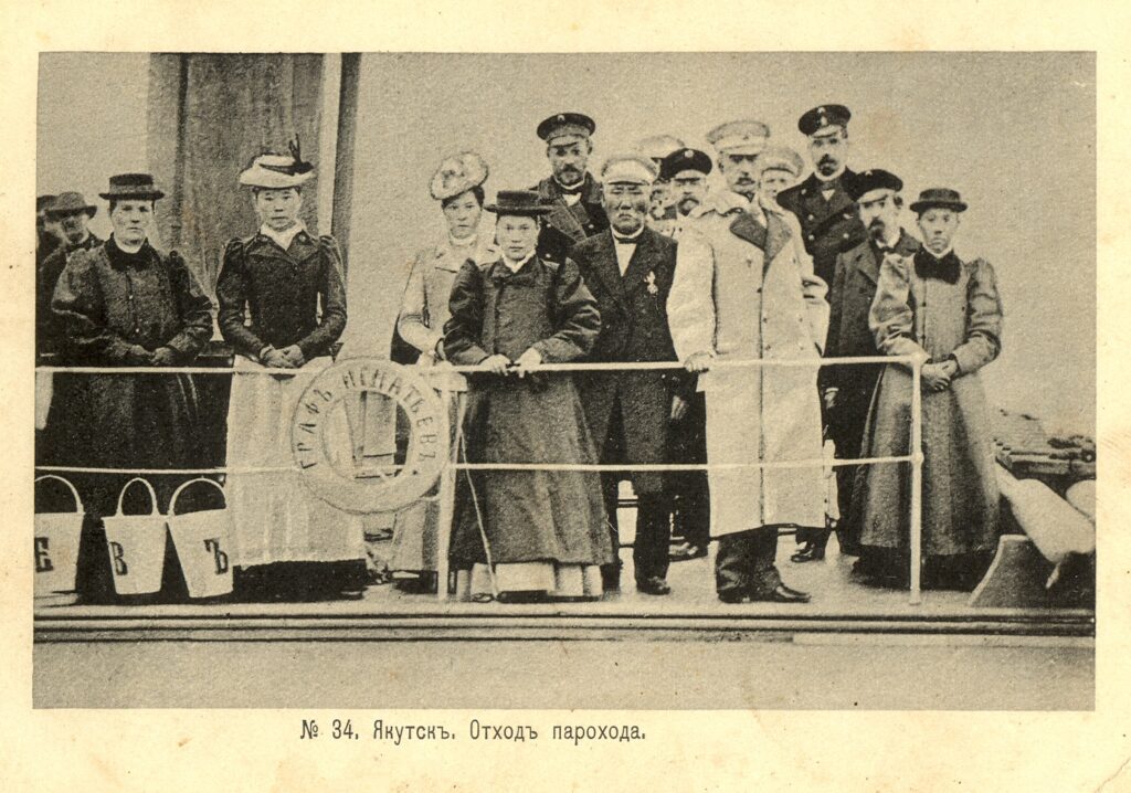 Большая удача, что фотограф попросил людей на фотографии встать таким образом, что в кадр попал спасательный круг — это сразу дает нам название парохода, что отходит от города Якутска: «Граф Игнатьев».