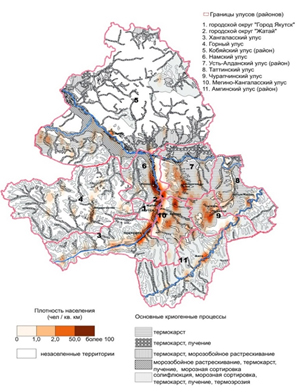- ОЦЕНКА УЯЗВИМОСТИ/УСТОЙЧИВОСТИ СЕЛЬСКИХ ПОСЕЛЕНИЙ ЦЕНТРАЛЬНОЙ ЯКУТИИ К ПОСЛЕДСТВИЯМ ИЗМЕНЕНИЯ КЛИМАТА И ДЕГРАДАЦИИ МНОГОЛЕТНЕМЕРЗЛЫХ ПОРОД. Применение междисциплинарного подхода позволило впервые на основе синхронизации данных хозяйственного типа расселения, разновременных карт расселения и плотности населения с основными криогенными процессами, приводящими к деградации многолетнемерзлых пород (ММП), выявить взаимосвязь процессов деградации ММП с характеристиками расселений и типов ландшафта. Проведённый пространственный анализ в специально созданной ГИС «Уязвимость /устойчивость сельских сообществ Центральной Якутии к деградации ММП и изменения климата» позволил установить, что наиболее опасные процессы идут в межаласном и приводораздельном слабодренированном типах местности. Для таких ландшафтов характерно развитие термокарста. На участках распространения термокарста плотность населения составляет более 50 чел. на 1 кв. км. (см. рис. 1). Исследование расширяет понимание механизмов взаимодействия природных и социальных аспектов деградации ММП. Полученные результаты важны для развития теории устойчивости человеческих сообществ в условиях экстремальных природно-климатических условий. Кроме того, они позволяют создать базу для принятия обоснованных решений по обеспечению устойчивого развития сельского хозяйства, инфраструктуры и жизнеспособности сельских общин и разработать рекомендации по снижению негативных последствий глобального потепления и деградации ММП.