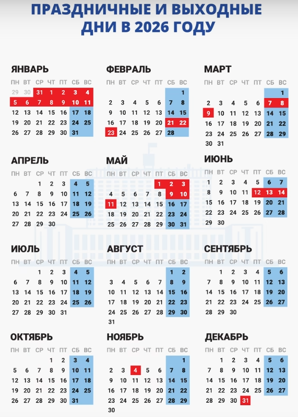 В 2026 году утверждены следующие праздничные и выходные дни: