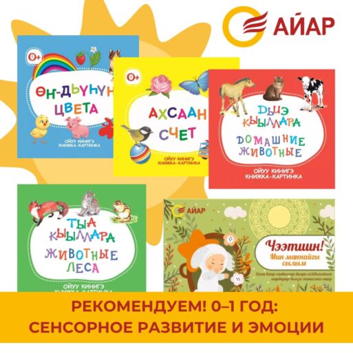 Малышам отлично подойдут картонные книжки с простыми рисунками и контрастными цветами. Например, книжки издательства «Айар» — «Счет», «Домашние животные», «Животные леса», «Цвета». А родителям советуем «Чээтиин! Мин маҥнайгы сылым», где вы можете фиксировать развитие вашего малыша.