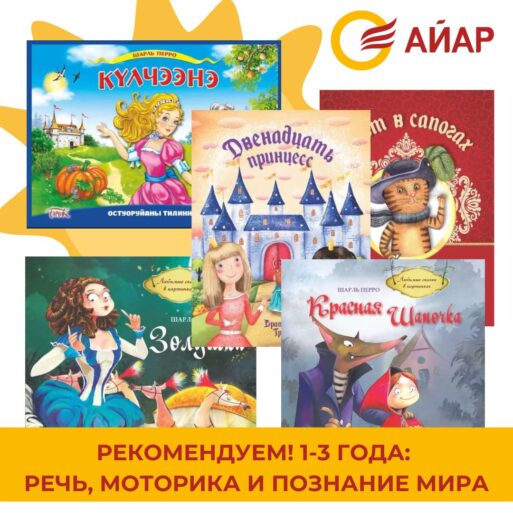 Подойдут книжки-панорамки, стишки, книги с подвижными элементами и наклейками, энциклопедии для малышей. Айар рекомендует для этого возраста панорамную книжку «Күлчээнэ», стишки малышам «Оотой-тоотой оҕолорго», любимые сказки с крупными иллюстрациями — «Золушка», «Красная Шапочка», «Кот в сапогах», «12 принцесс».