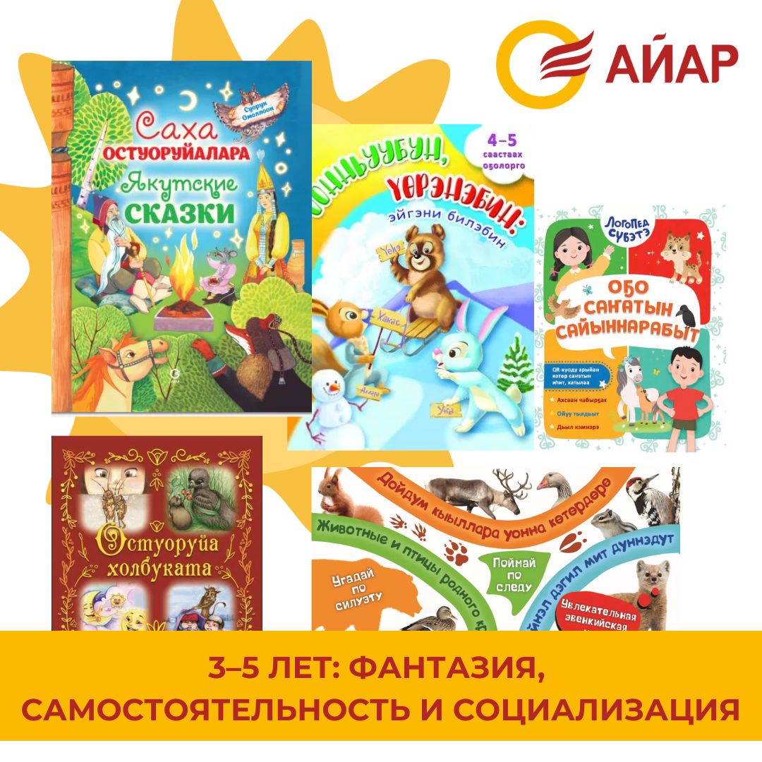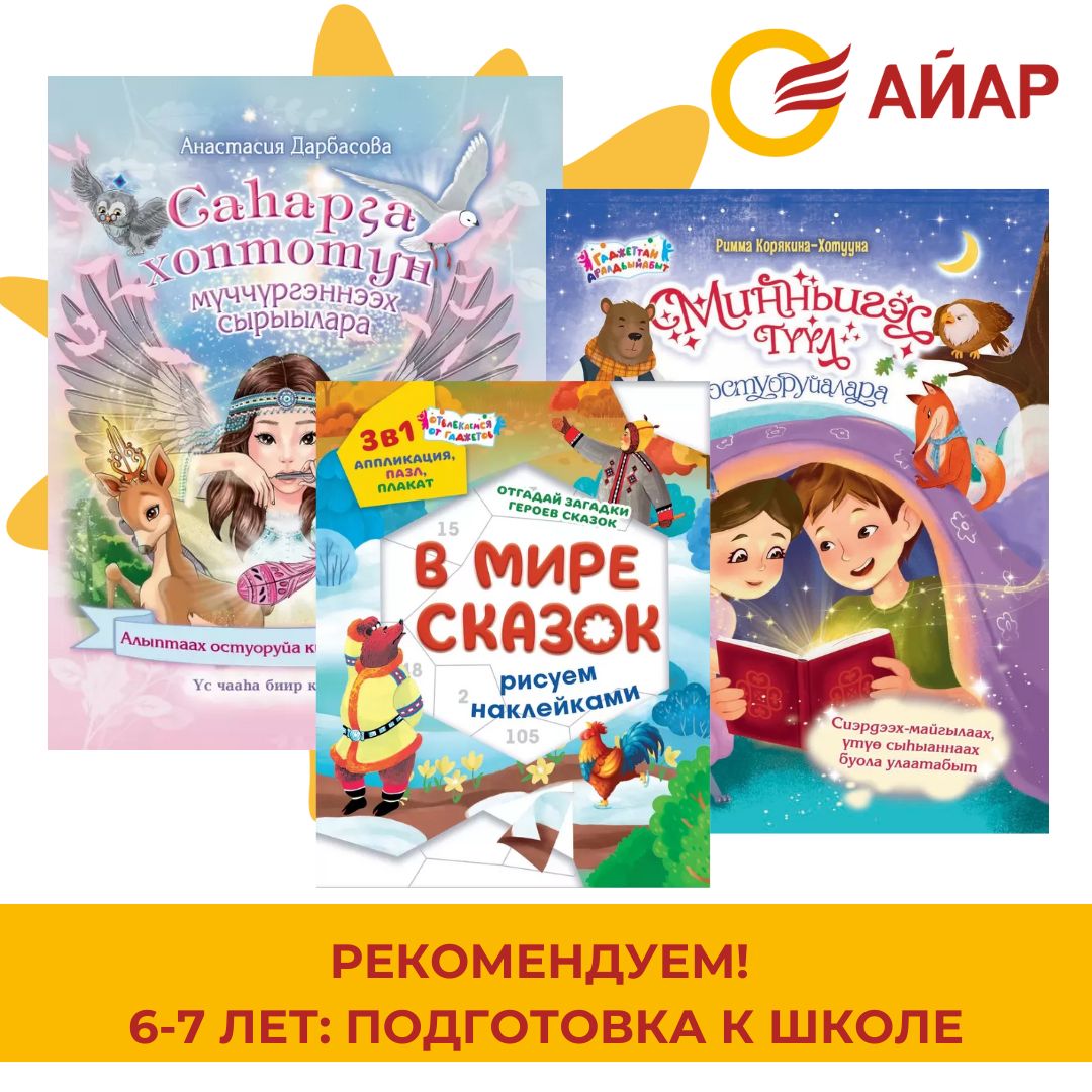 Издательство «Айар» предлагает полезные и увлекательные материалы для всестороннего развития ребенка. Мини-книги на якутском языке «Чыыса уонна Элиэчээн», «Күн, Ый уонна Сулус», «Сүллүүкүн харчыта», «Мотуо уонна Таракаан» в наборе, сказки народного писателя Якутии Д.К. Сивцева-Суоруна Омоллоона, написанные по мотивам произведений устного народного творчества на двух языках «Якутские сказки», развивающие речь и воображение.