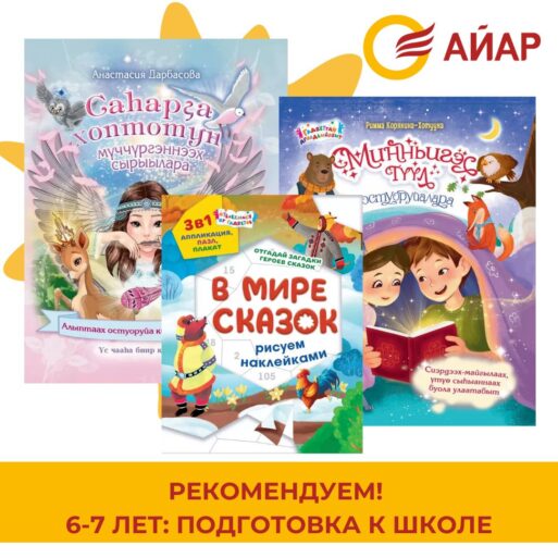Сказка об отважной розовой чайке Лола «Саһарҕа хоптотун мүччүргэннээх сырыылара», уютные, убаюкивающие сказки с крылатыми словами якутского народного поэта Ивана Мигалкина «Минньигэс түүл остуоруйалара» подойдут для семейного чтения. А в книге «В мире сказок: рисуем наклейками» ребенок может наклейками раскрашивать картины, собирать пазлы и даже делать аппликации, что поможет развивать мелкую моторику, знать числа и цифры, отгадывать загадки, быть аккуратным и усидчивым.