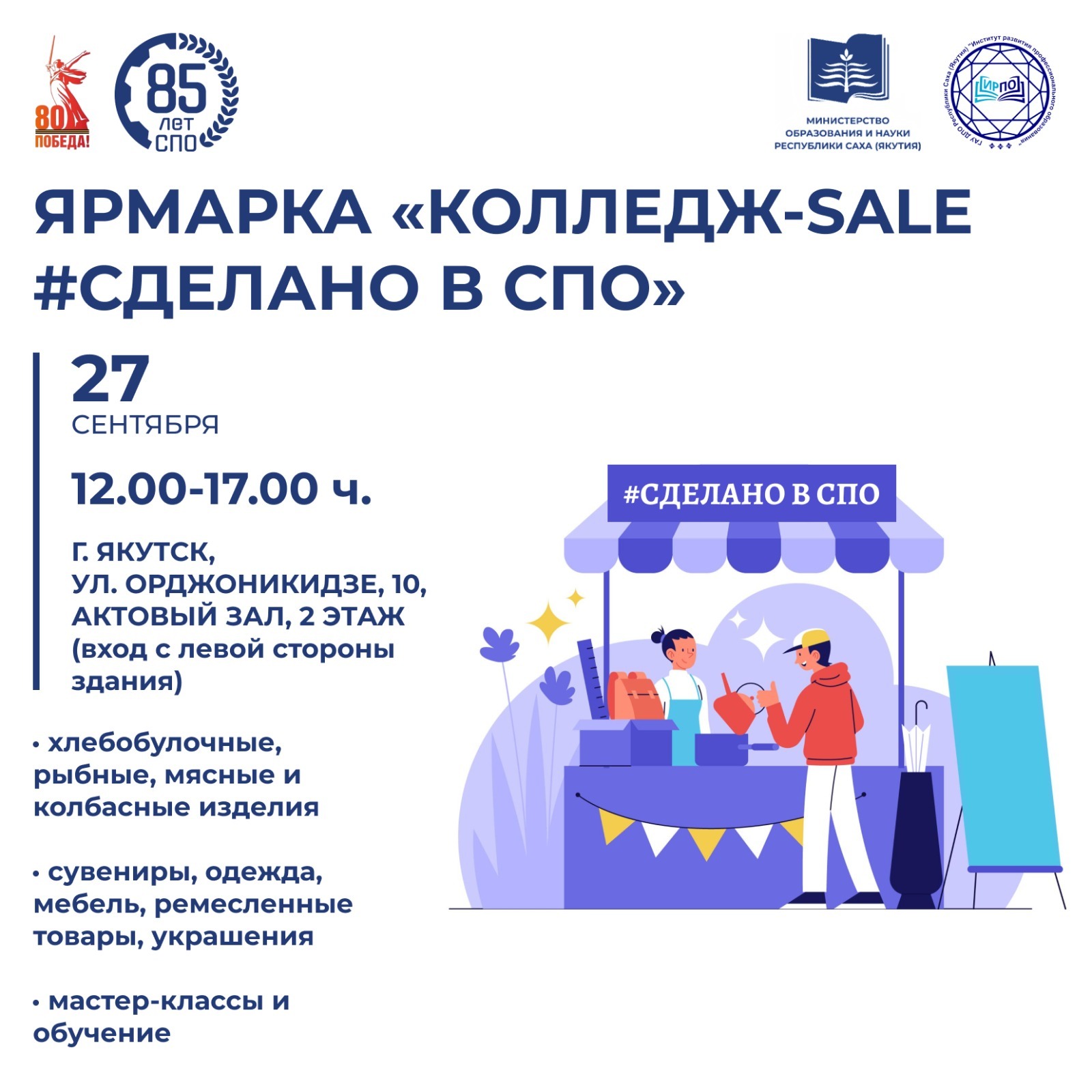 27 сентября в Якутске состоится ярмарка товаров и услуг колледжей и техникумов «Колледж-SALE #Сделано в СПО», приуроченная к празднованию 85-летия системы среднего профессионального образования России. Мероприятие пройдёт с 12:00 до 17:00 часов по адресу: улица Орджоникидзе, 10 (вход с левой стороны, 2 этаж, актовый зал).