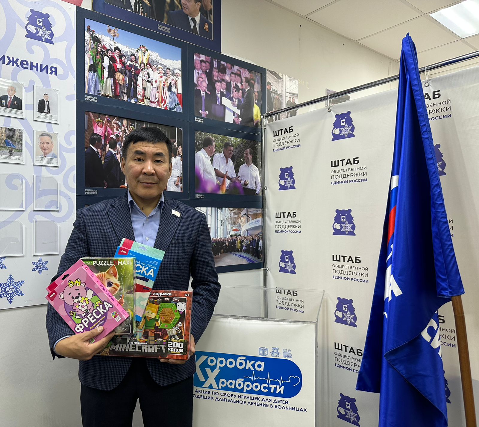 Депутат Якутской городской Думы Яков Оконешников также принял участие, доставив игрушки в штаб общественной поддержки партии «Единая Россия».