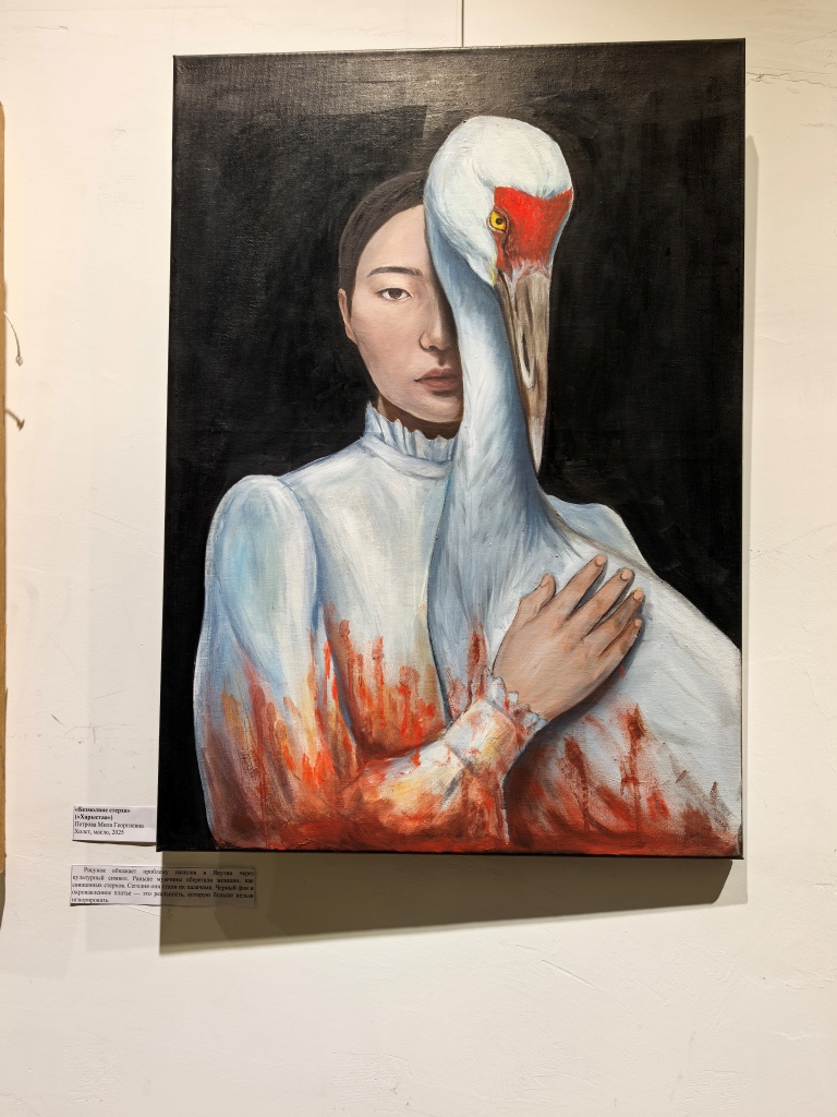 На афише выставки – картина Милы Петровой «Безмолвие стерха», девушка в окровавленном платье со стерхом на руках. Автор обнажает, пожалуй, самую болезненную тему современности – проблему насилия над женщиной.