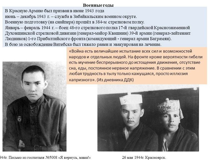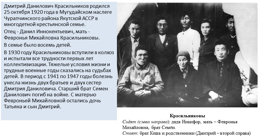 Д.Д. Красильников родился 25 октября 1920 года в селе Мугудай Чурапчинского района Якутской АССР в крестьянской семье. В 1937 году с отличием закончил Чурапчинскую семилетнюю школу и поступил на рабфак при Якутском педагогическом институте. По окончании рабфака работал учителем математики и русского языка в неполных средних школах Усть-Алданского и Чурапчинского районов ЯАССР. 1943-1944 гг. – был на фронте, воевал на территории Белоруссии в составе 17-й Духовщинской Краснознаменной дивизии первого Прибалтийского фронта. В одном из боев под Витебском получил тяжелое ранение. После лечения в 1944 году был демобилизован из рядов Советской Армии. Осенью 1944 года поступил на учебу в Якутский пед. институт на физико-математический факультет. В 1948 году, после окончания Якутского педагогического института, Красильников Д.Д. был принят на работу в качестве младшего научного сотрудника станции космических лучей при Якутской базе АН СССР. Свои исследования Д.Д. Красильников начал с изучения метеорологических эффектов в космических лучах и экспериментально подтвердил теорию метеорологических эффектов Фейнберга-Дормана в вариациях интенсивности космических лучей.
