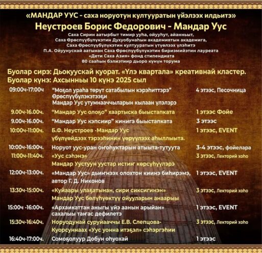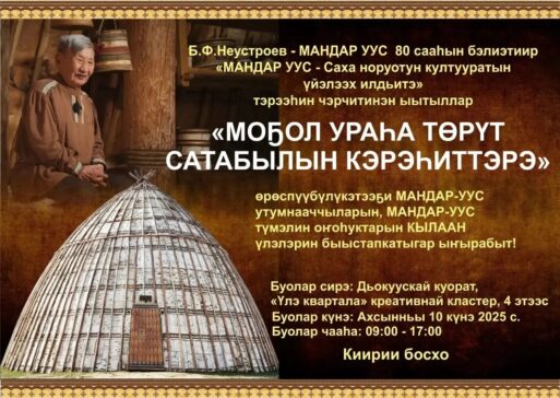 10 декабря в креативном кластере «Квартал Труда» состоится долгожданное мероприятие «Мандар Уус – вечный хранитель культуры народа саха», посвящённое 80-летнему юбилею Бориса Федоровича Неустроева – Мандар Ууса.