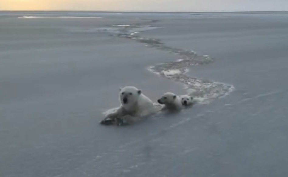 В Якутии сняли на видео плавающих в ледяной шуге белую медведицу с детенышами